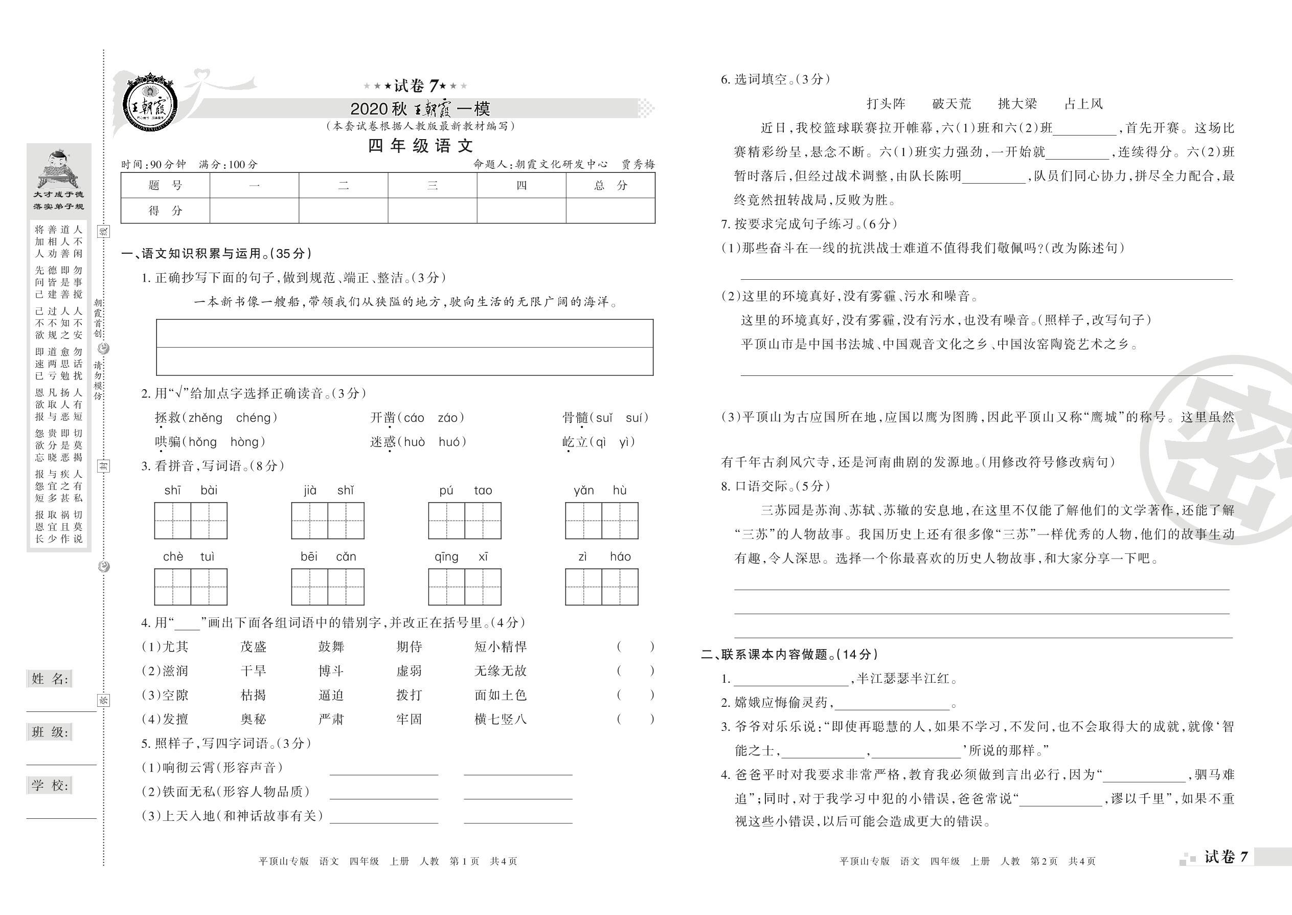 王朝霞期末模拟卷四年级上册语文(人教版)_R210801184609【7】