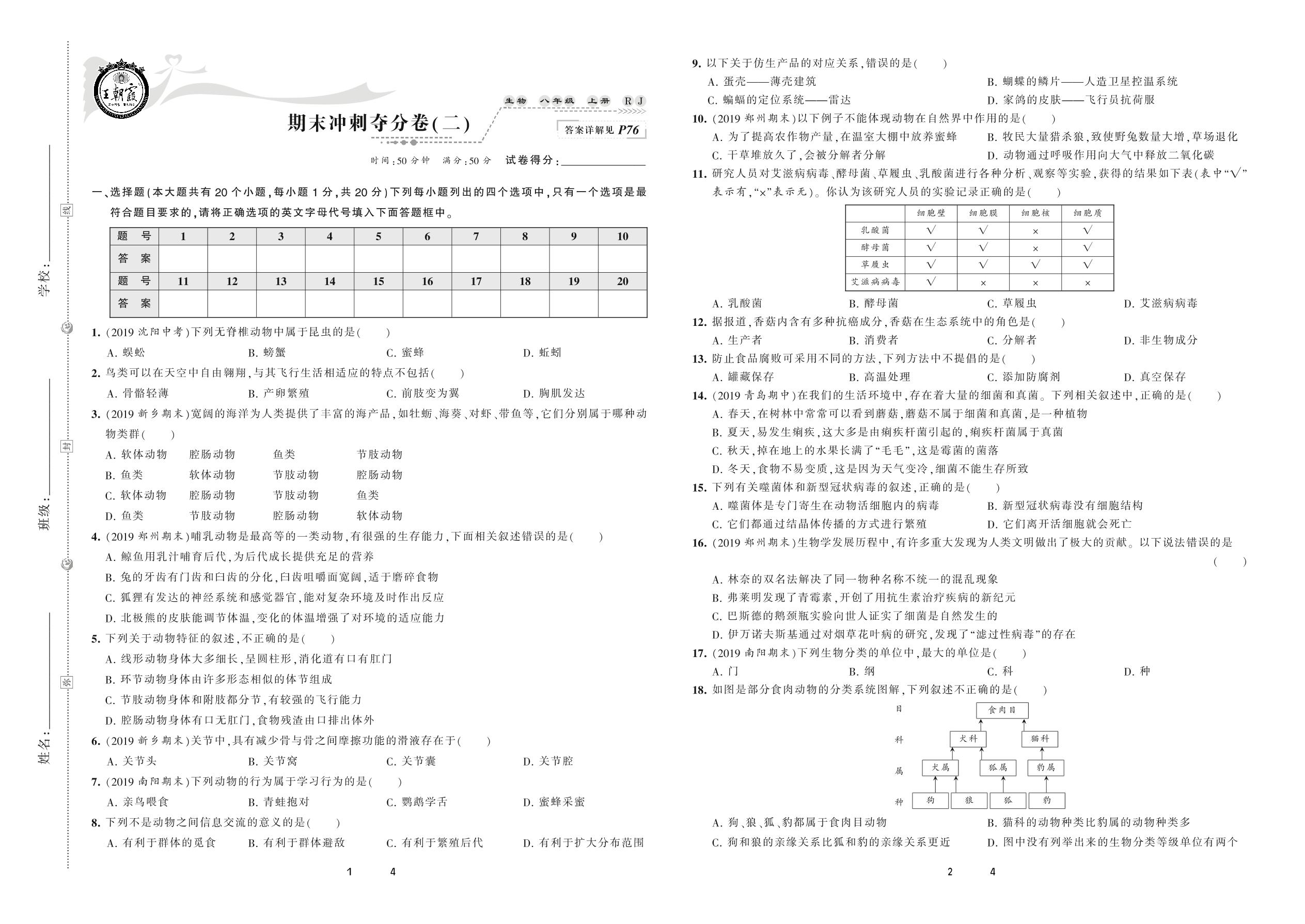 2020上册八年级生物人教版 期末冲刺夺分卷(二)
