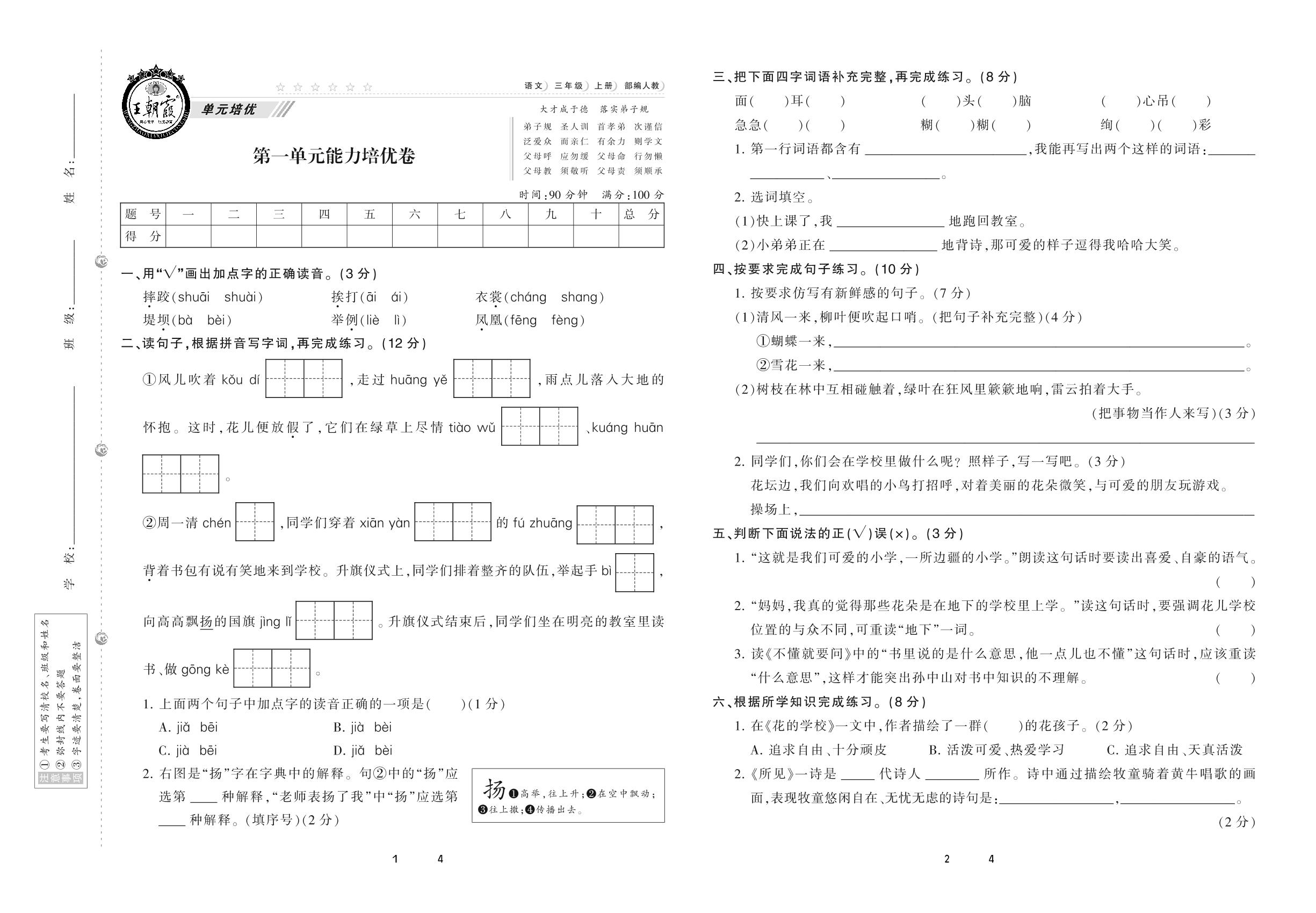 2020上册三年级语文人教版 第一单元 能力培优卷