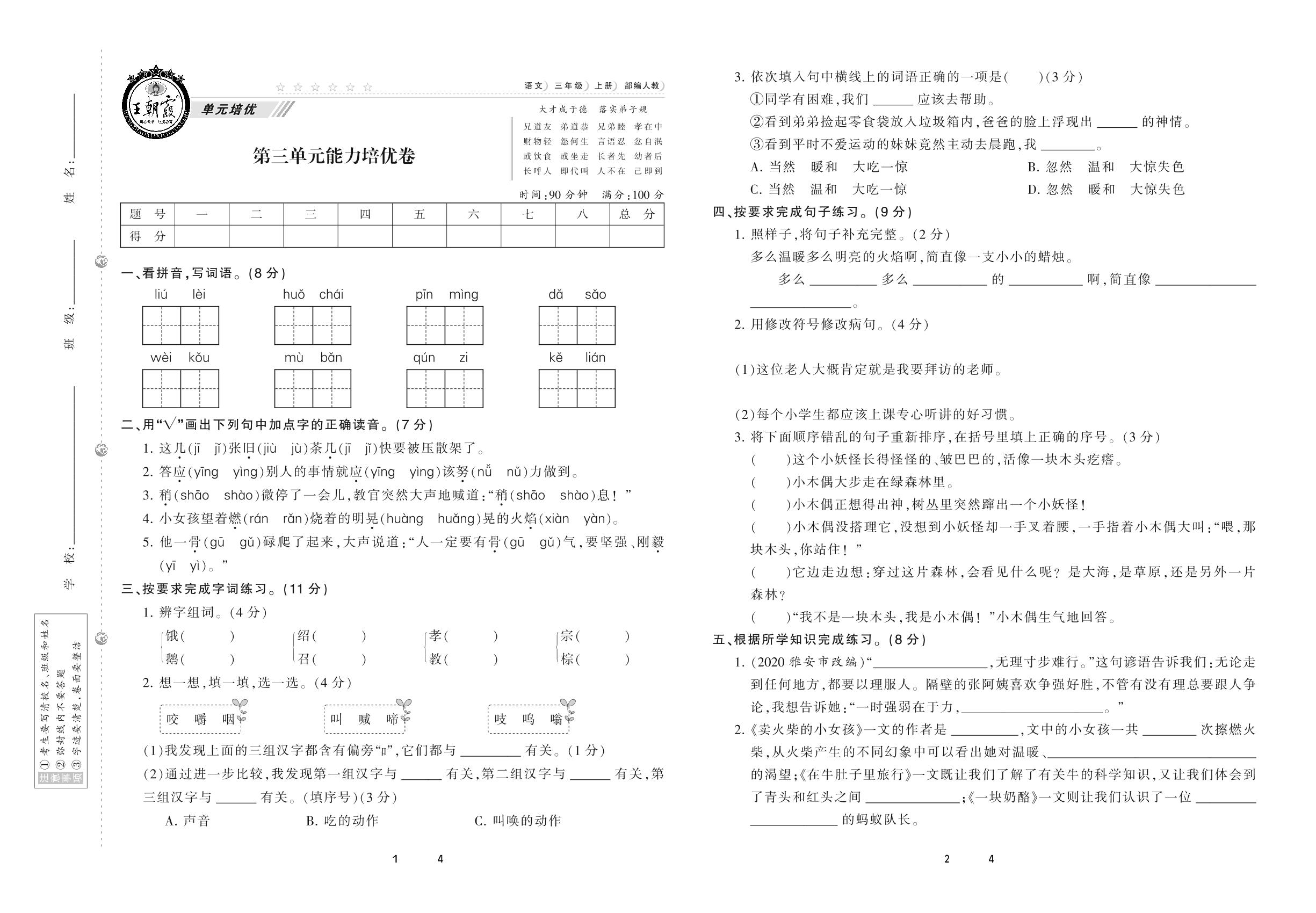 2020上册三年级语文人教版 第三单元 能力培优卷