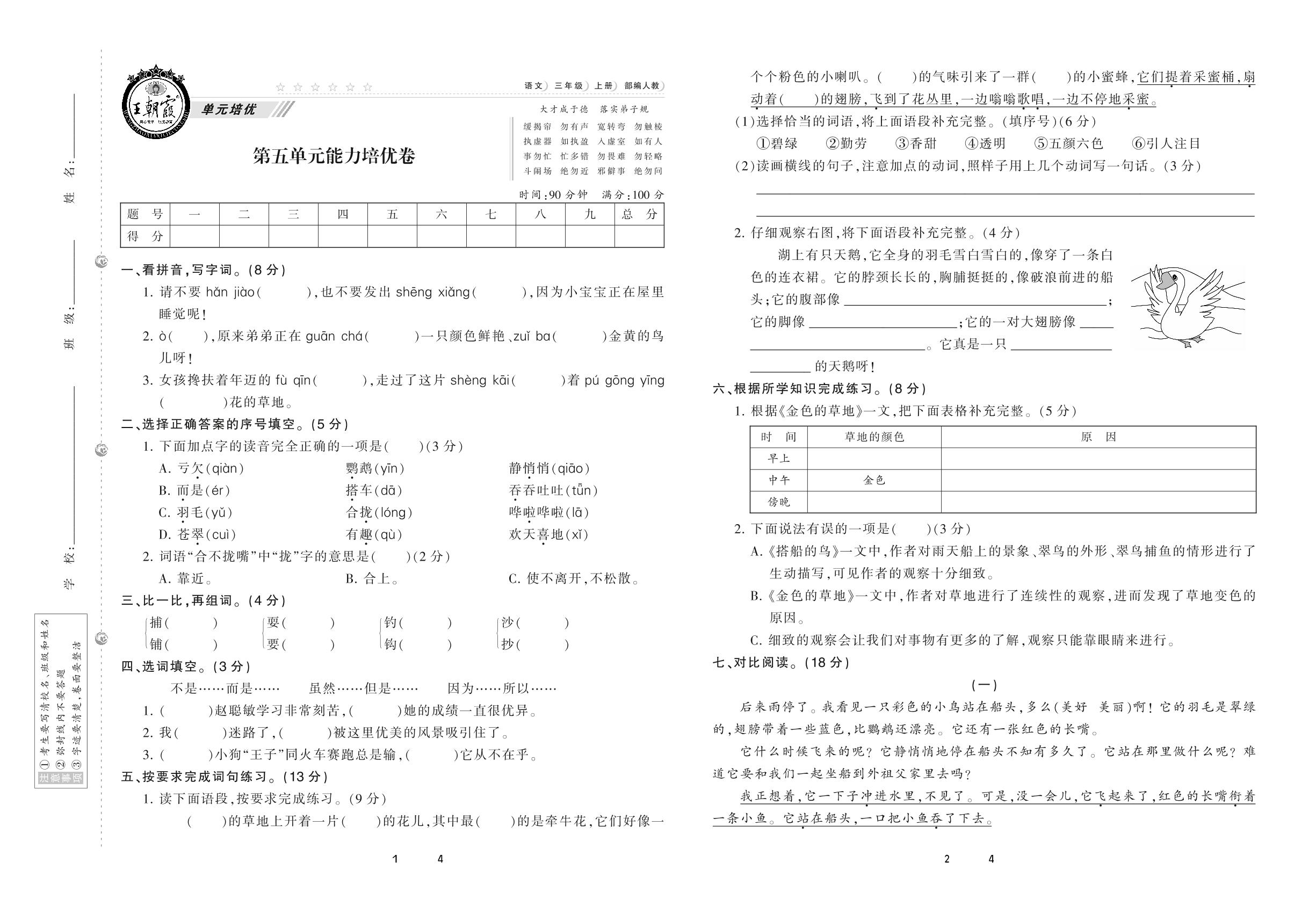 2020上册三年级语文人教版 第五单元 能力培优卷