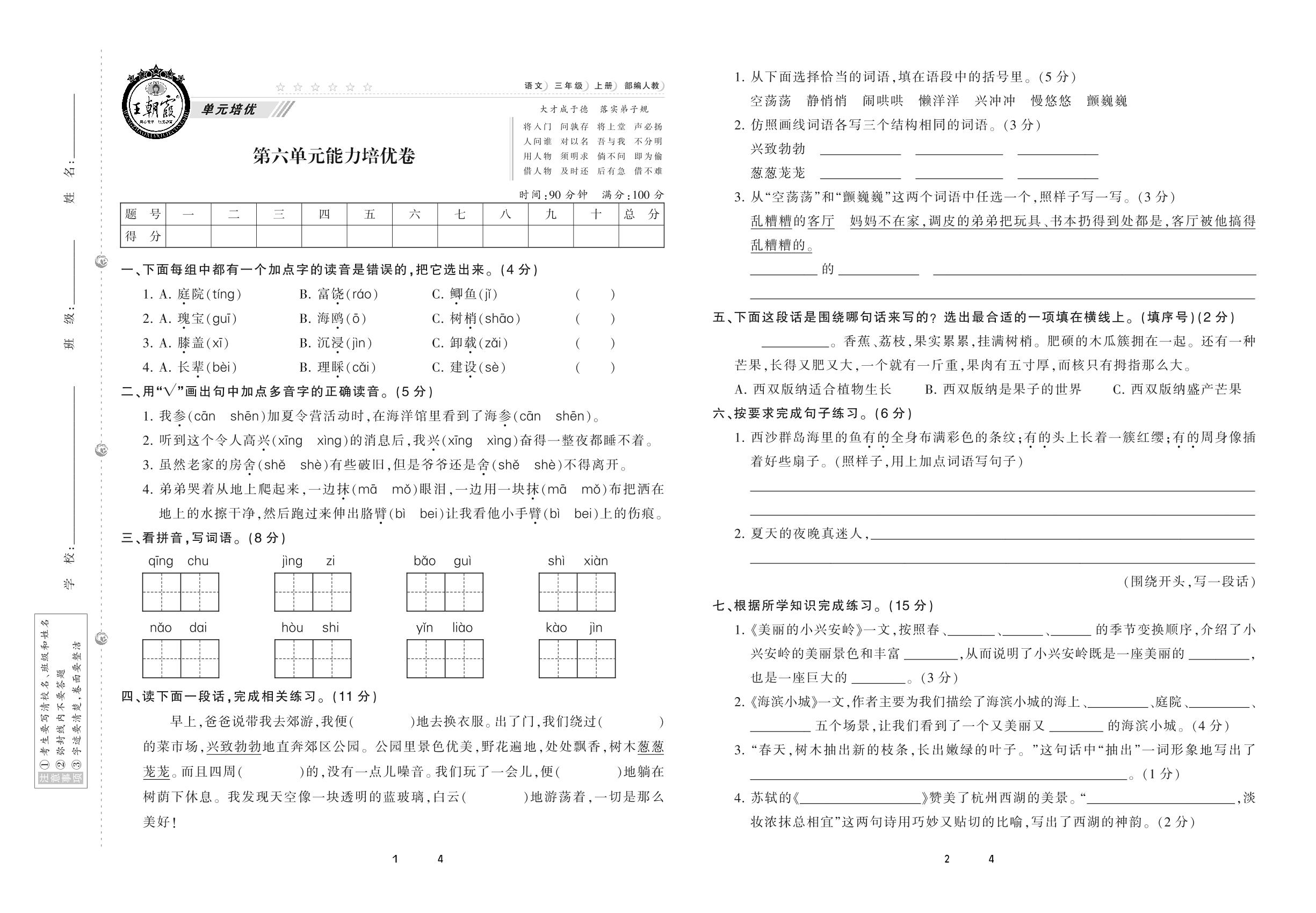 2020上册三年级语文人教版 第六单元 能力培优卷