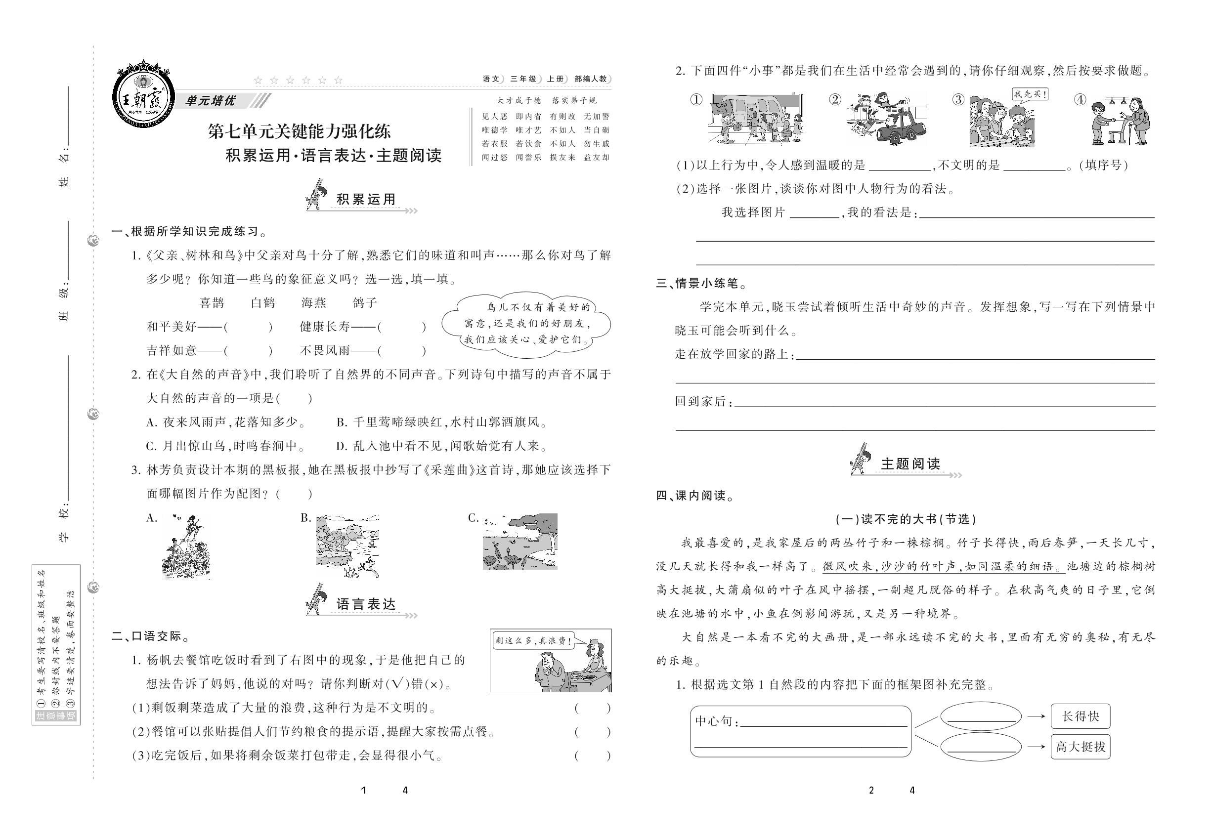 2020上册三年级语文人教版 第七单元 关键能力强化练