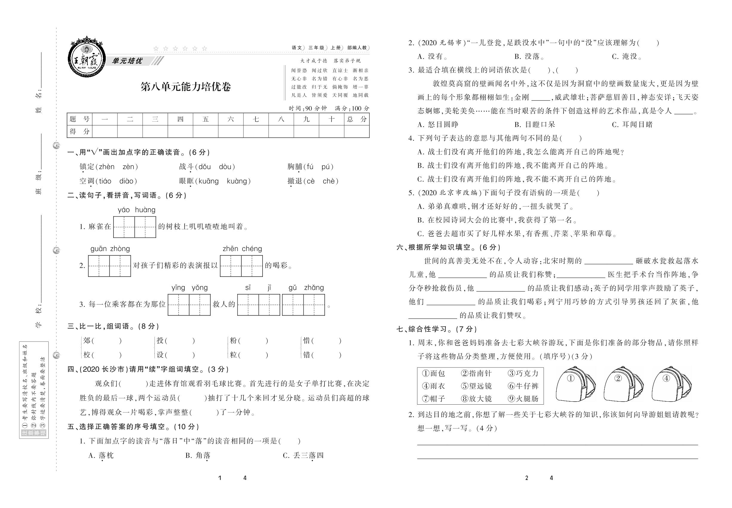 2020上册三年级语文人教版 第八单元 能力培优卷