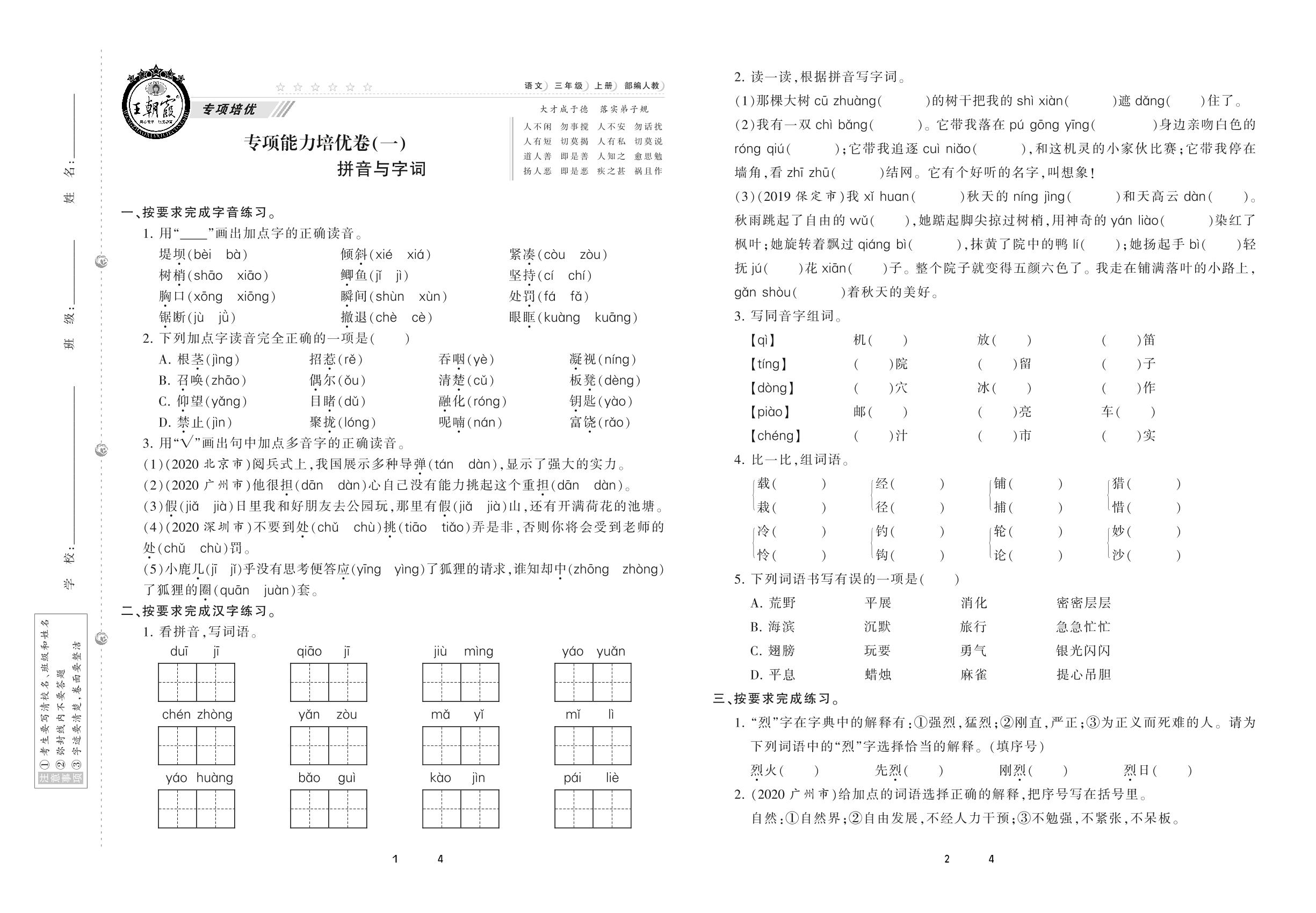 2020上册三年级语文人教版 专项能力培优卷(一) 拼音与字词