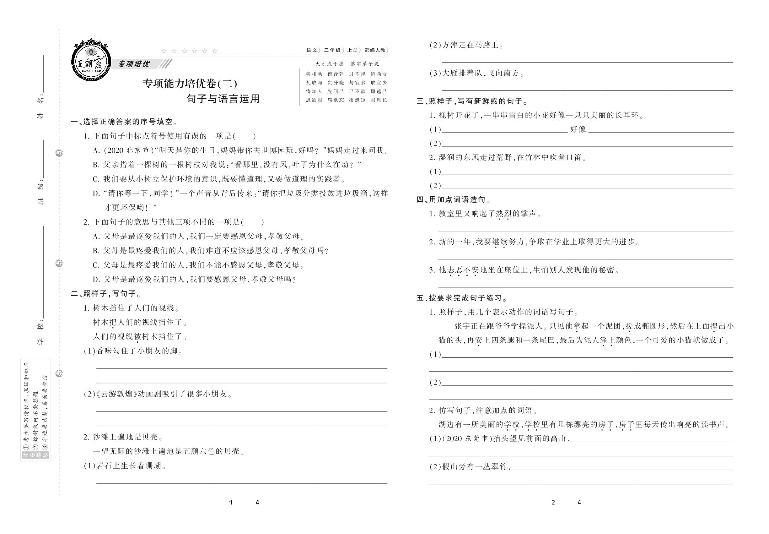 2020上册三年级语文人教版 专项能力培优卷(二) 句子与语言运用