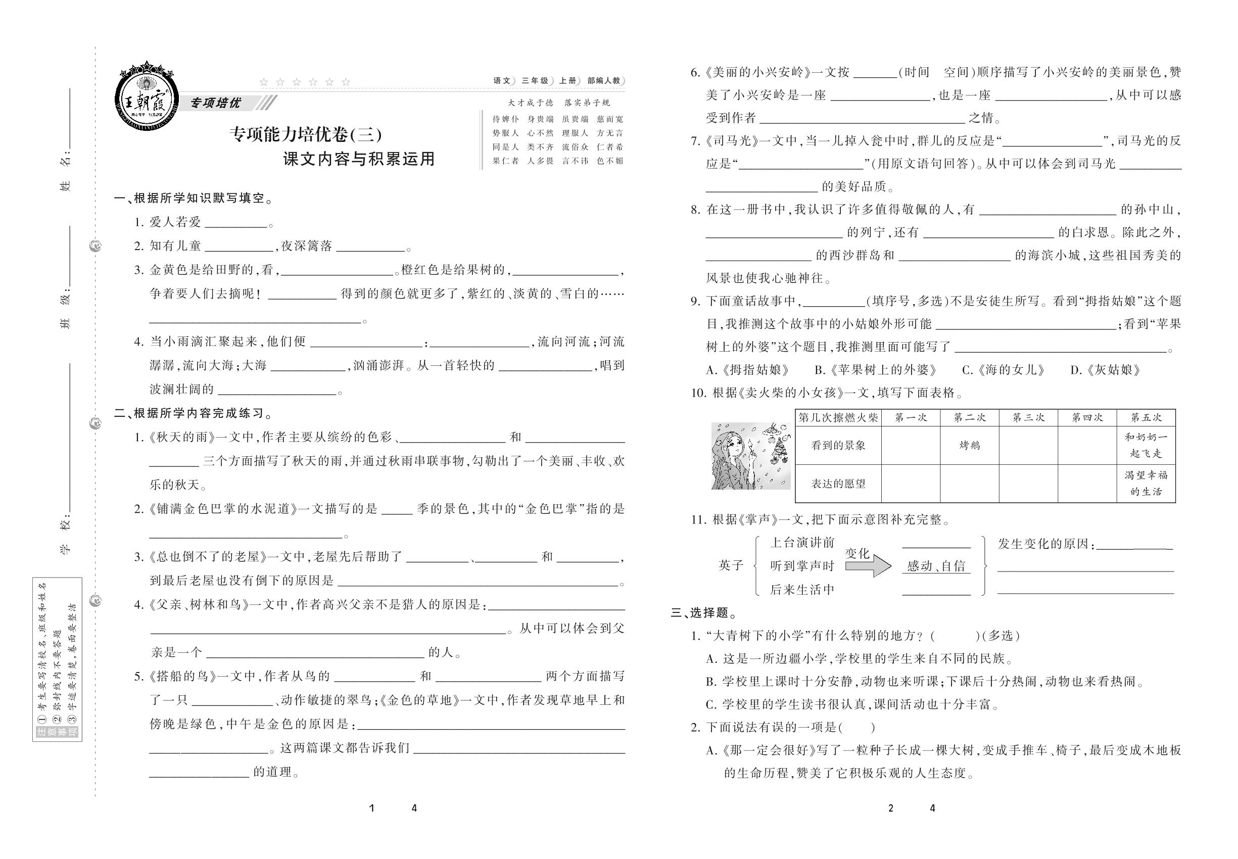 2020上册三年级语文人教版 专项能力培优卷(三) 课文内容与积累运用