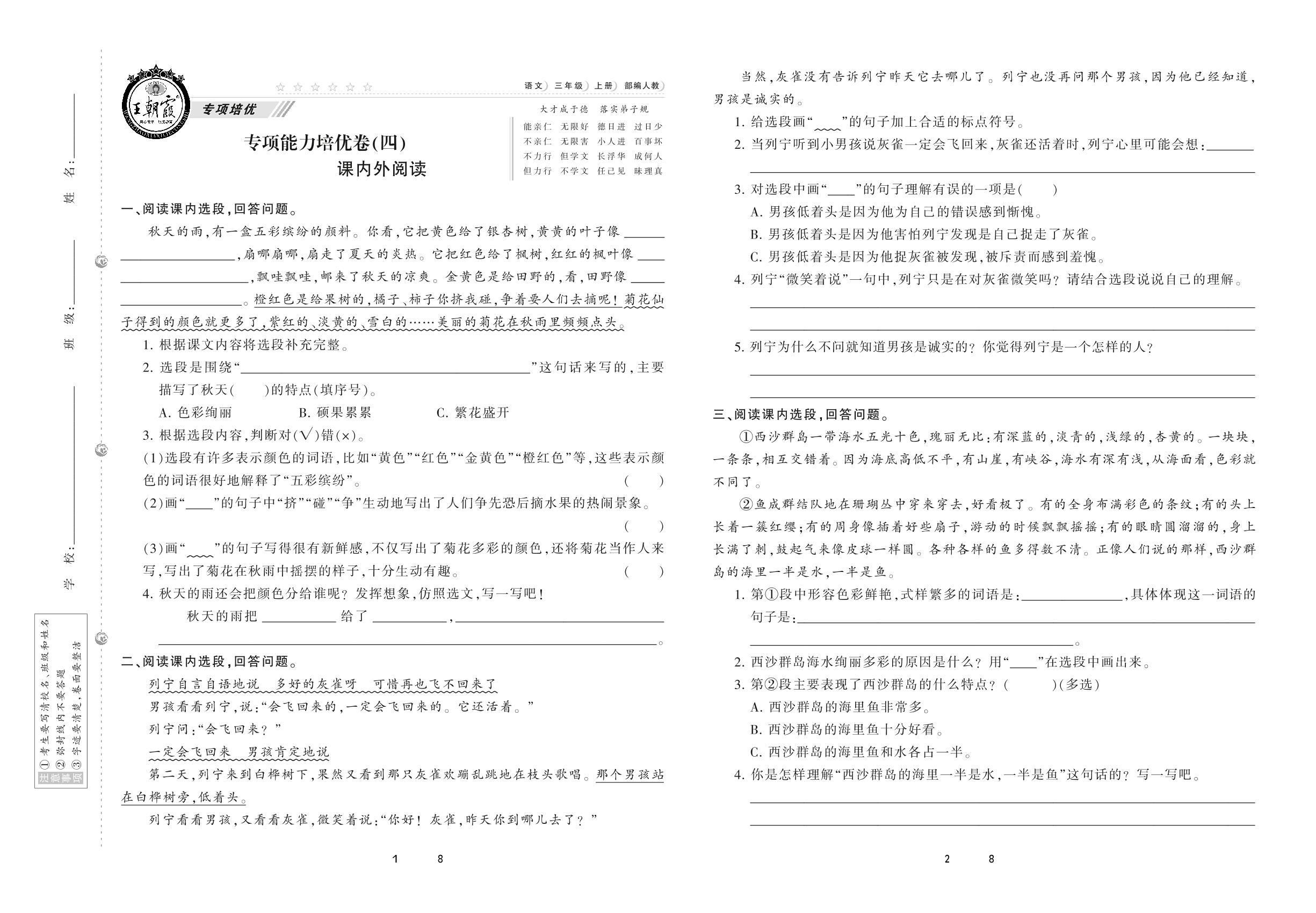 2020上册三年级语文人教版 专项能力培优卷(四) 课内外阅读