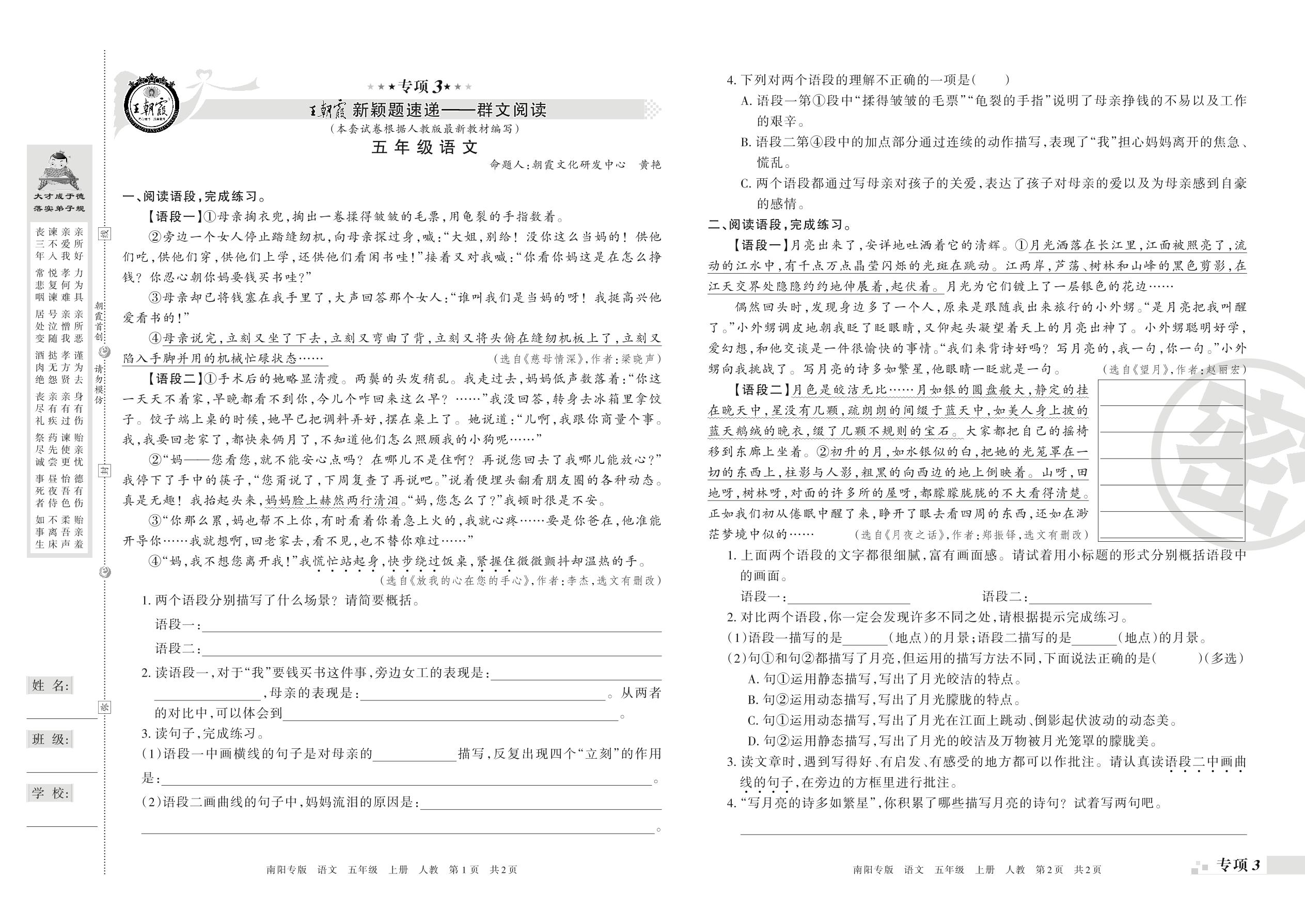 王朝霞期末专项卷——群文阅读、古诗文阅读五年级上册语文(人教版)