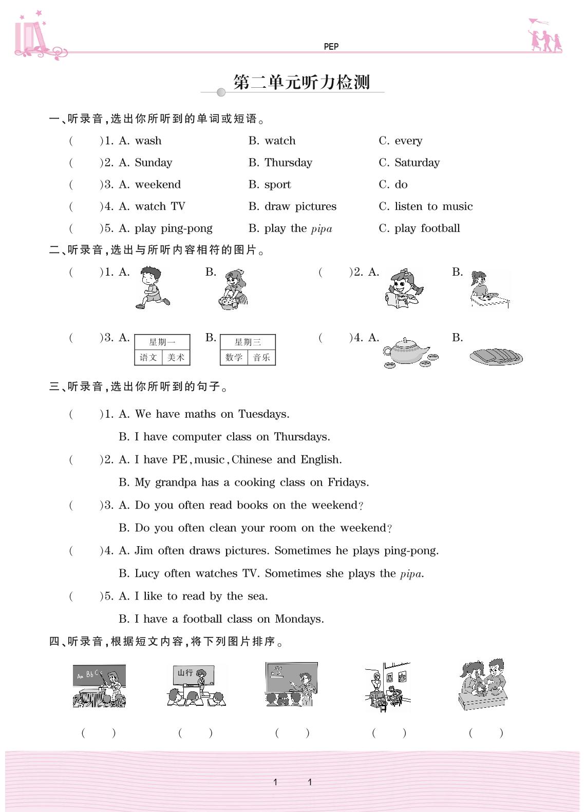 2020上册五年级英语PEP版 第二单元听力检测
