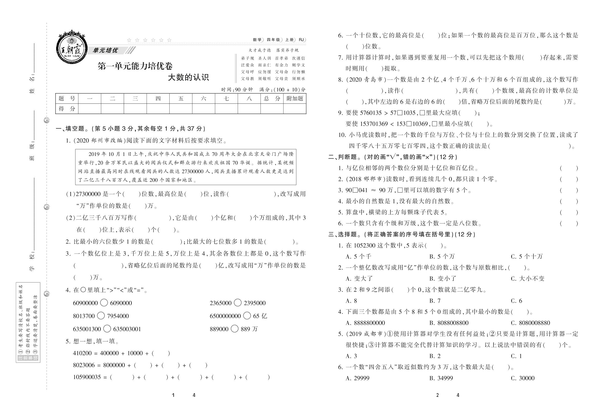 2020上册四年级数学人教版 第一单元 能力培优卷