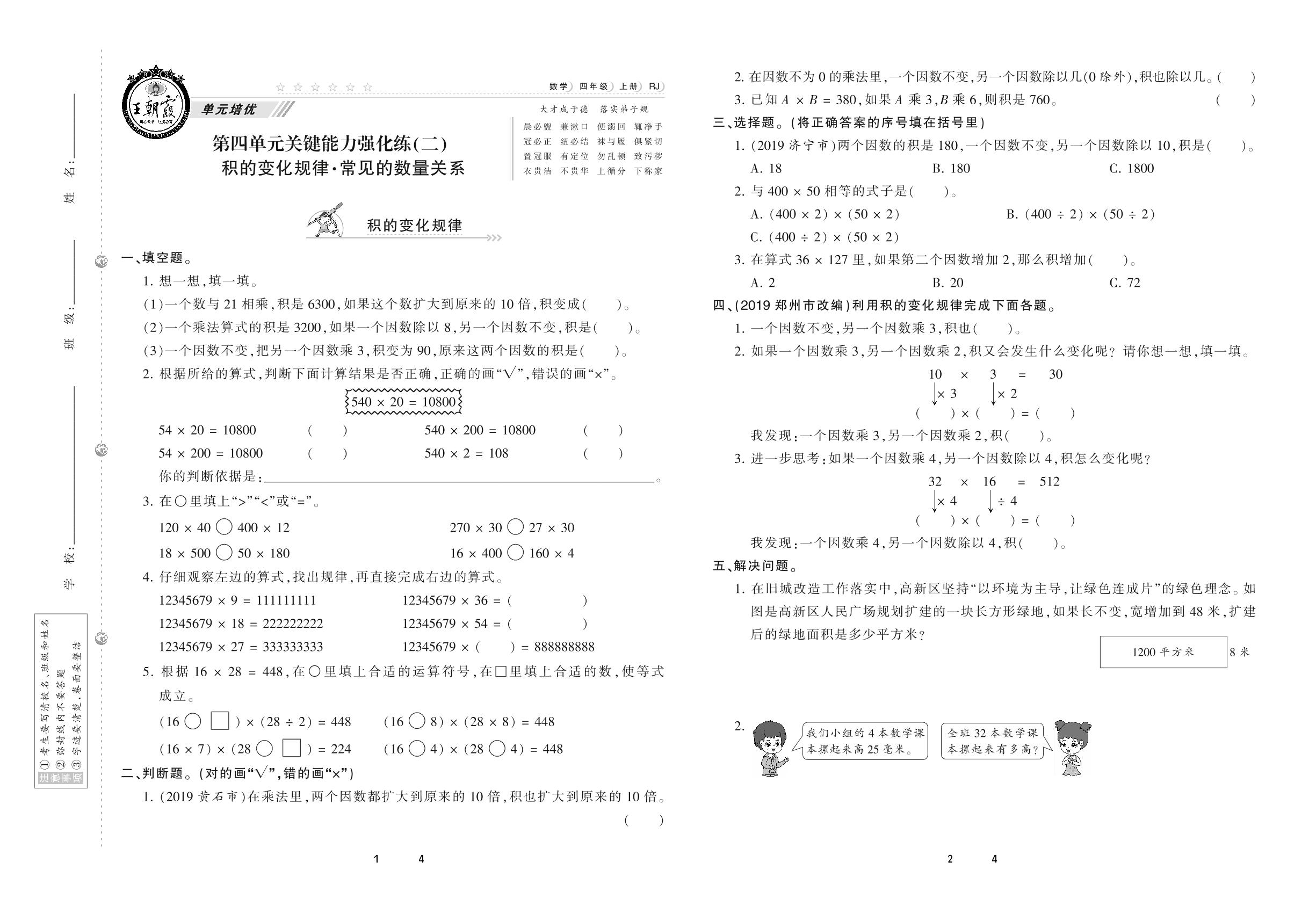 2020上册四年级数学人教版 第四单元 关键能力强化练(二)