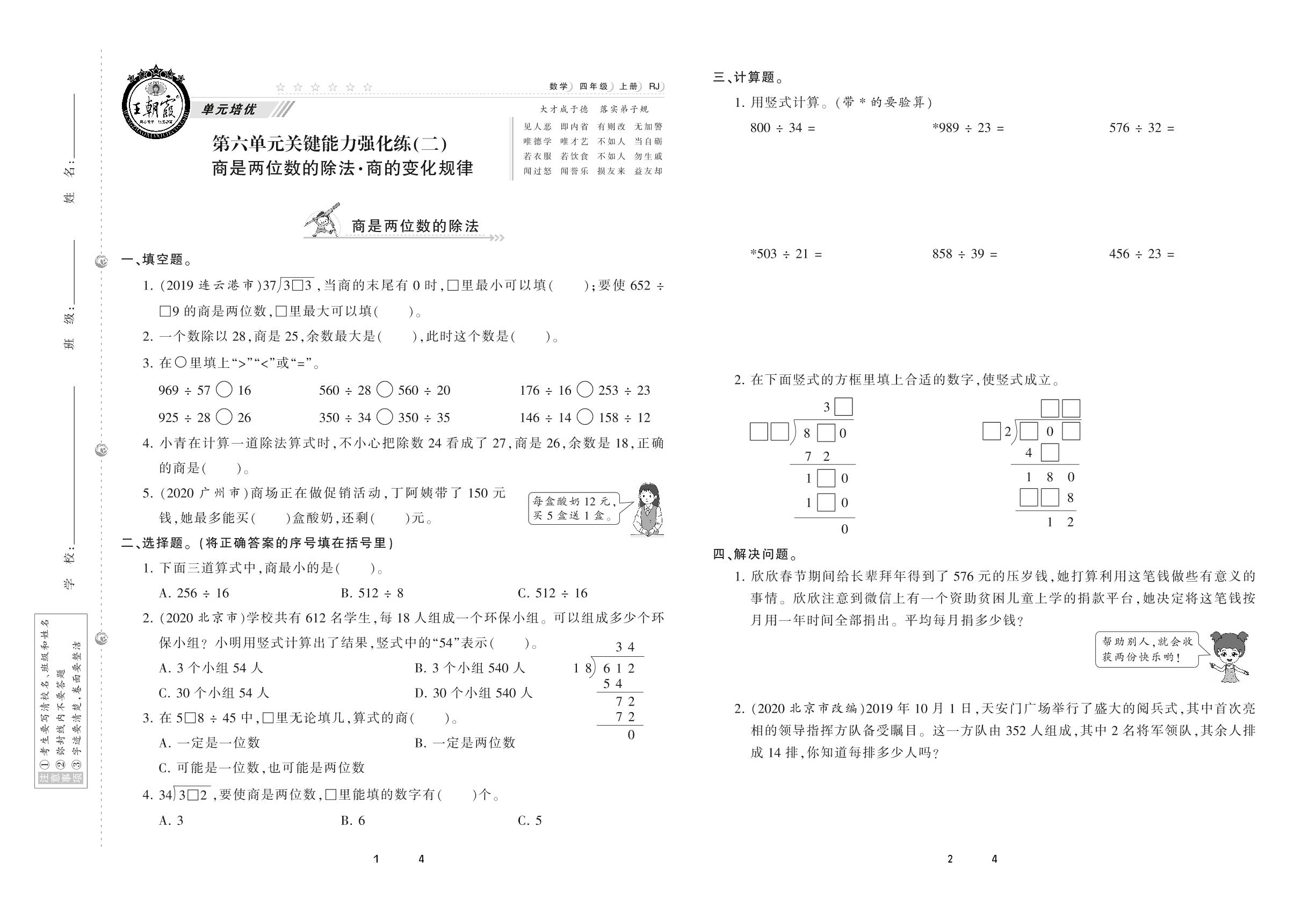 2020上册四年级数学人教版 第六单元 关键能力强化练(二)