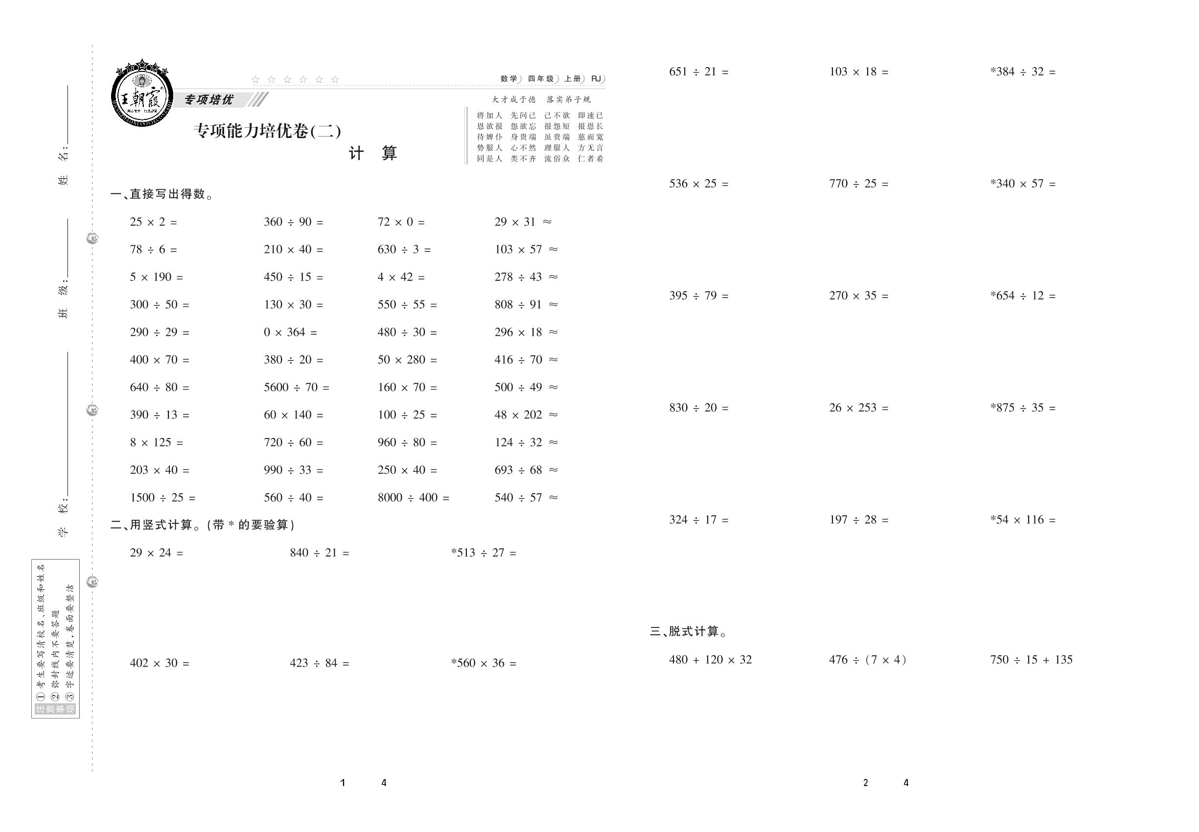 2020上册四年级数学人教版 专项能力培优卷(二) 计算
