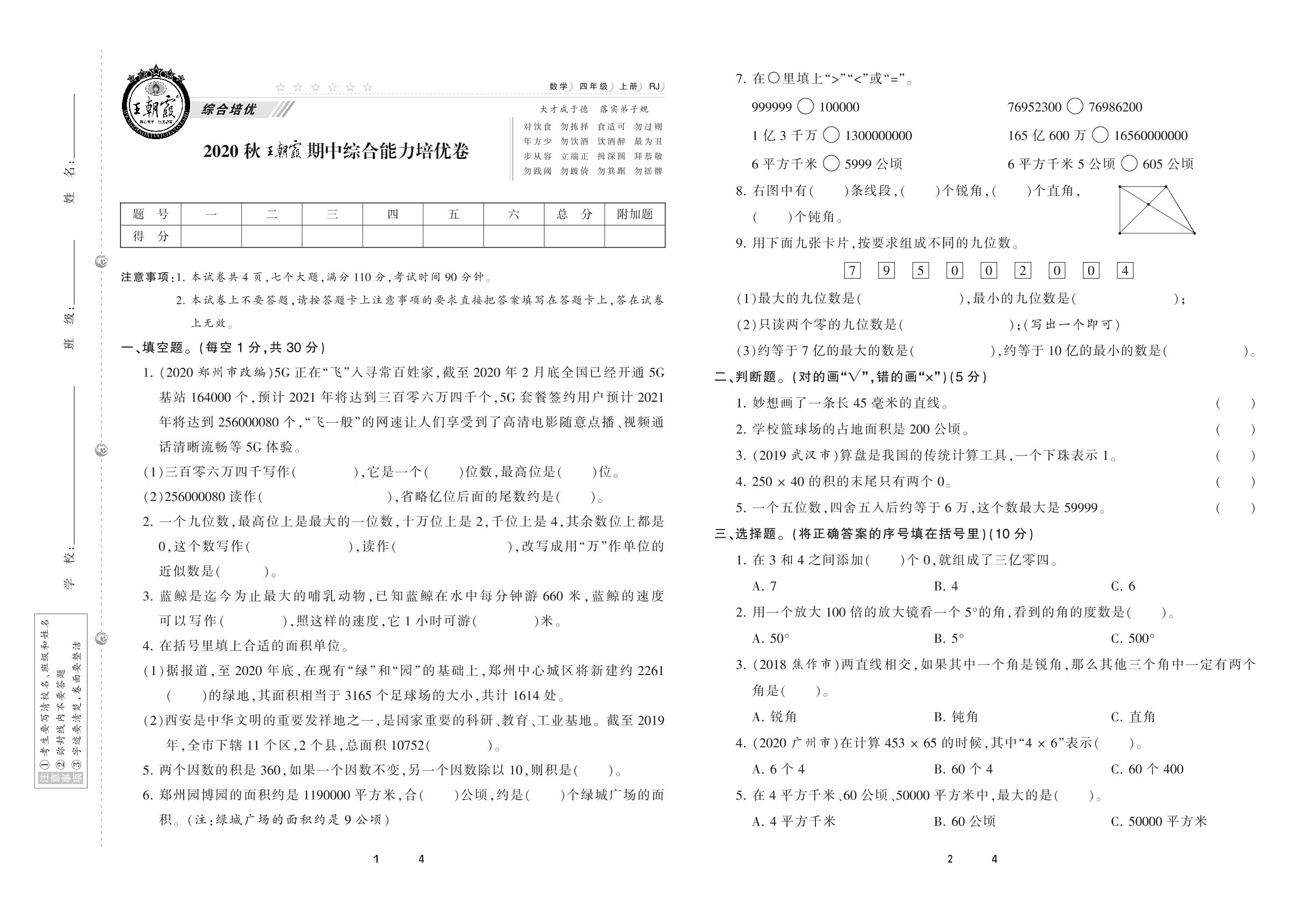 2020上册四年级数学人教版 王朝霞期中综合能力培优卷