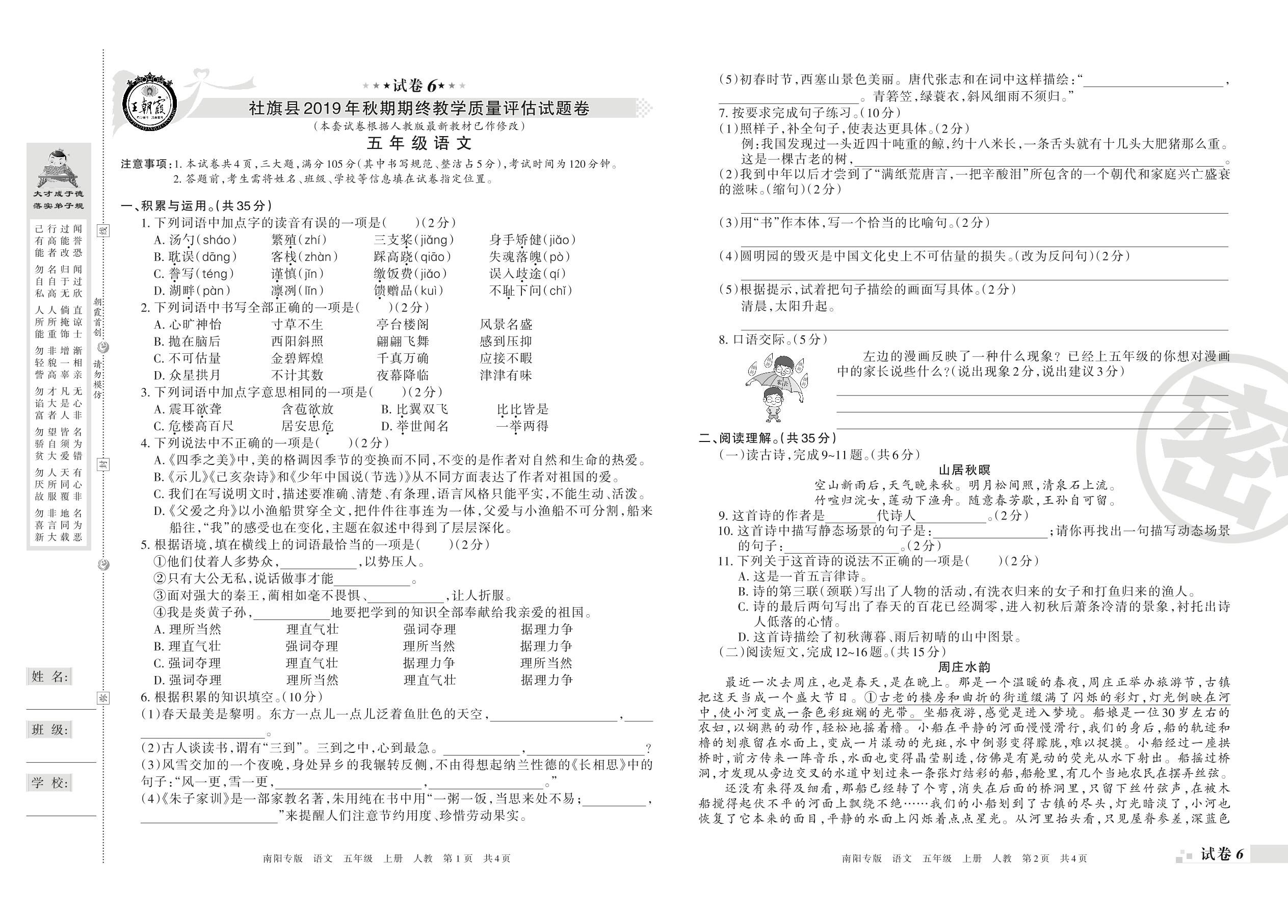 2019-2020学年第一学期南阳市社旗县五年级语文试卷(人教版)【6】