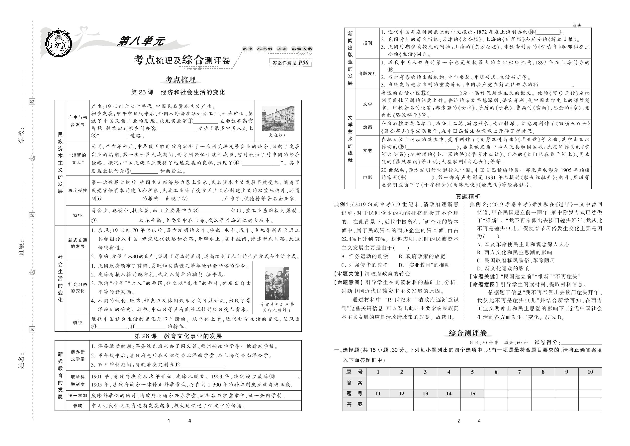 2020上册八年级历史人教版 第八单元 考点梳理及综合测评卷