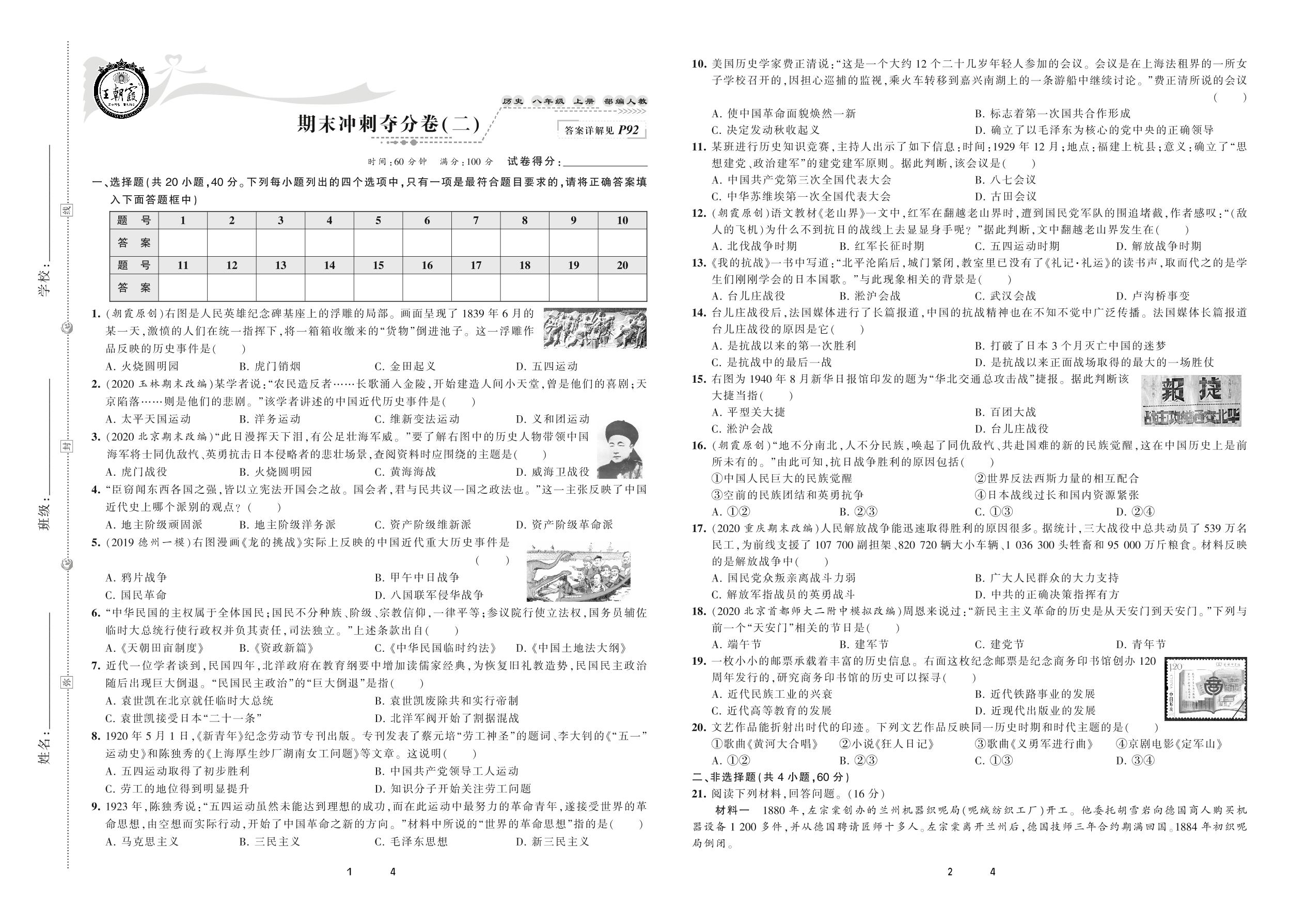 2020上册八年级历史人教版 期末冲刺夺分卷(二)