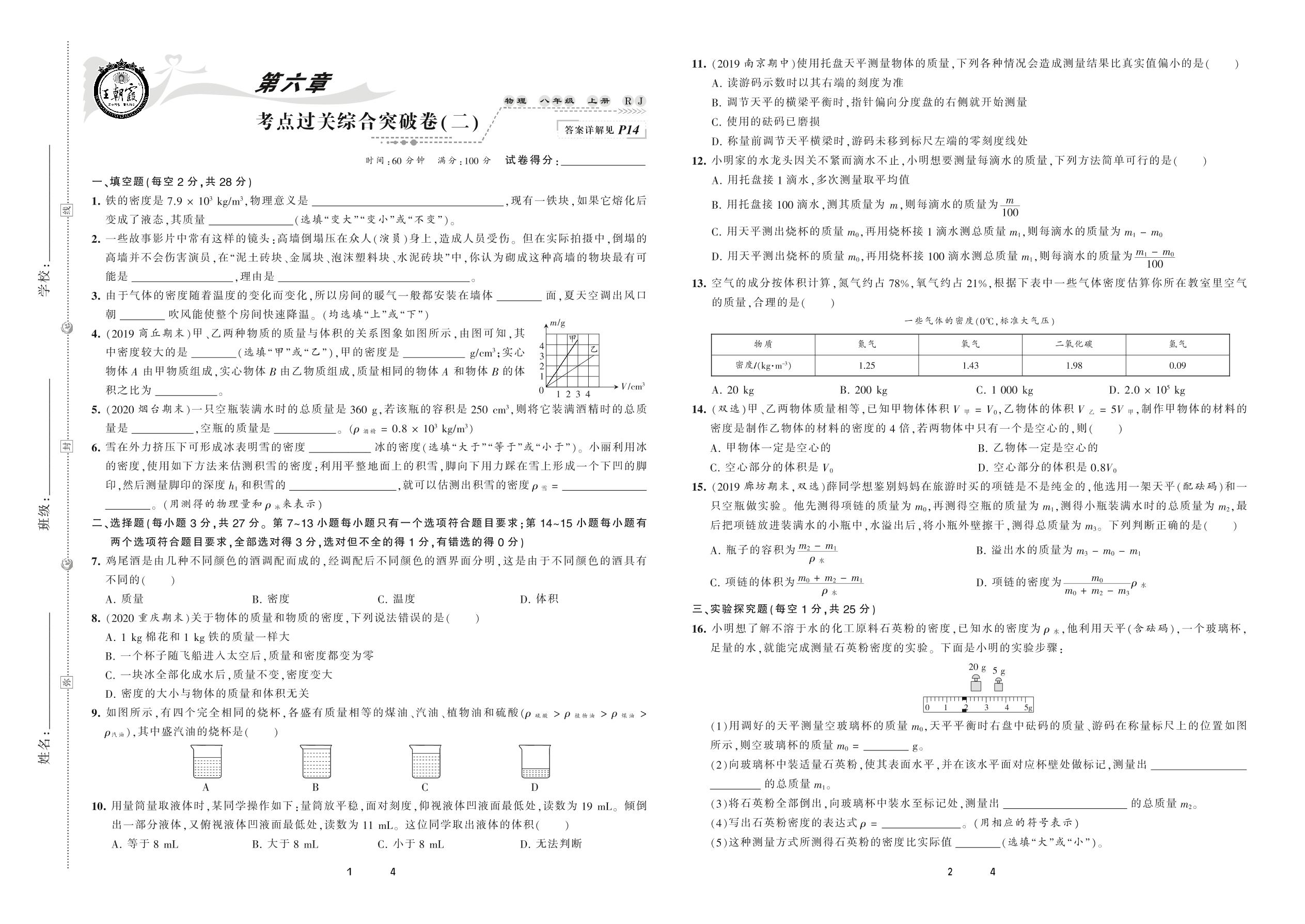 2020上册八年级物理人教版 第六章 考点过关综合突破卷(二)