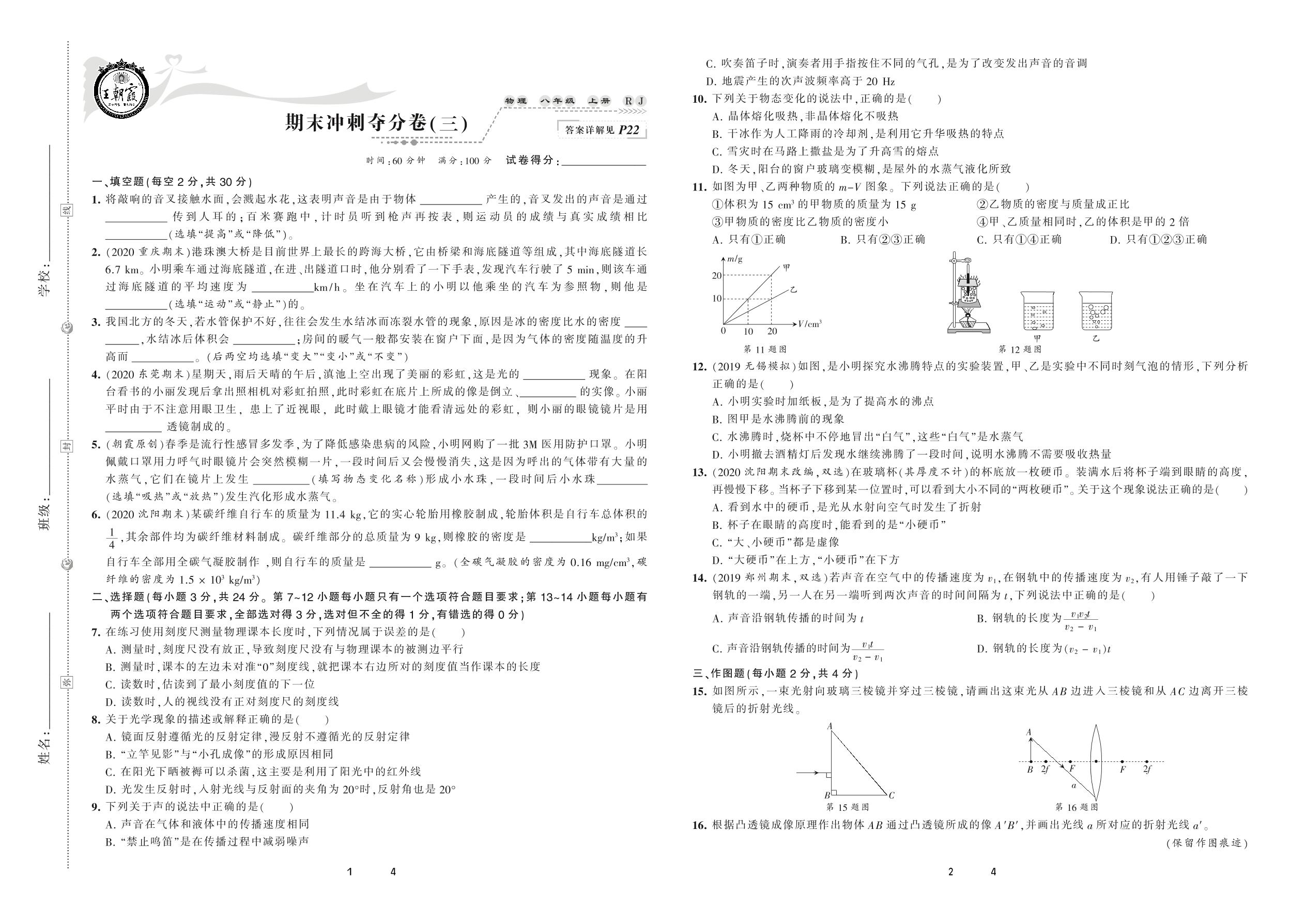 2020上册八年级物理人教版 期末冲刺夺分卷(三)