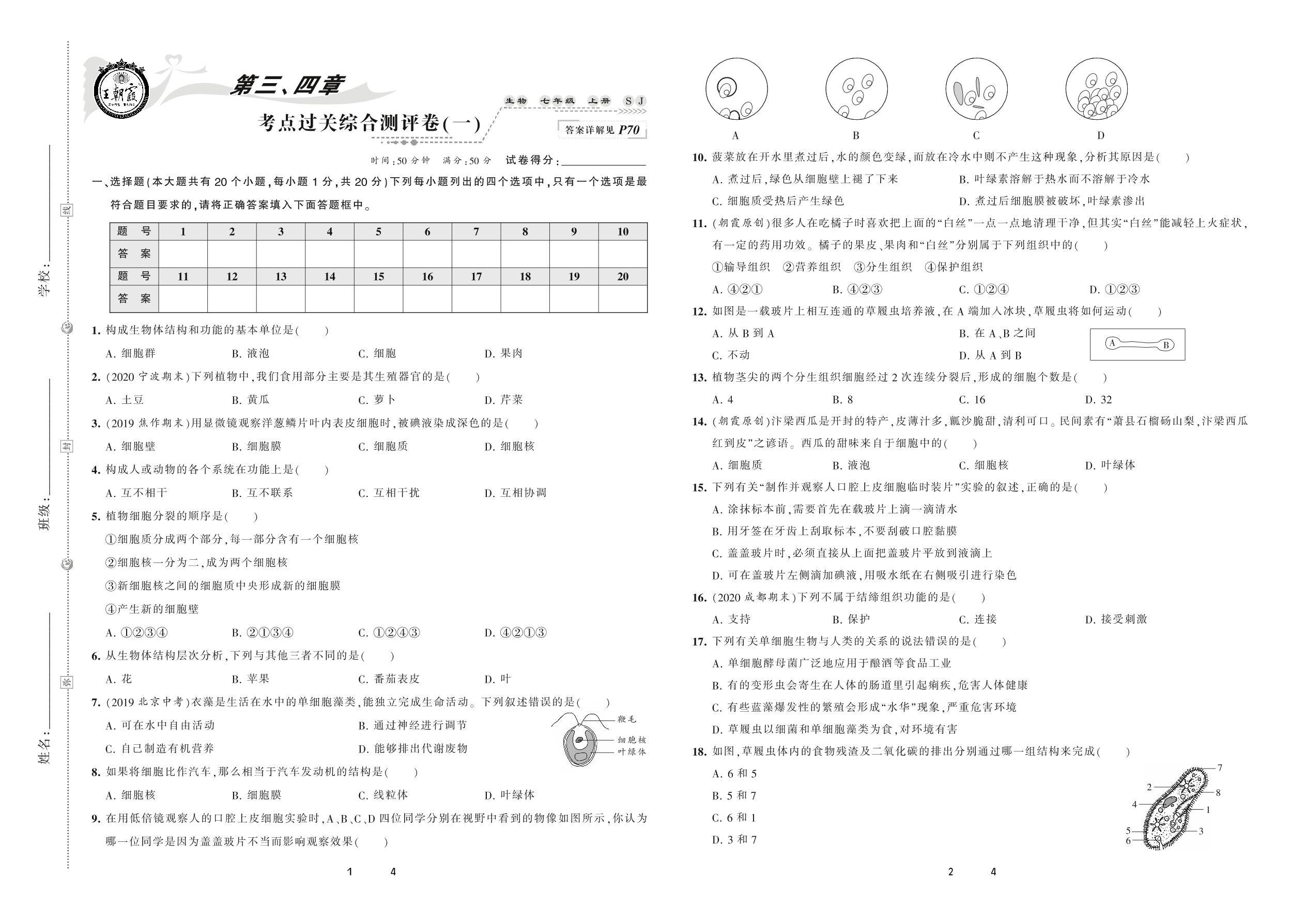 2020上册七年级生物苏教版 第三、四章 考点过关综合测评卷(一)