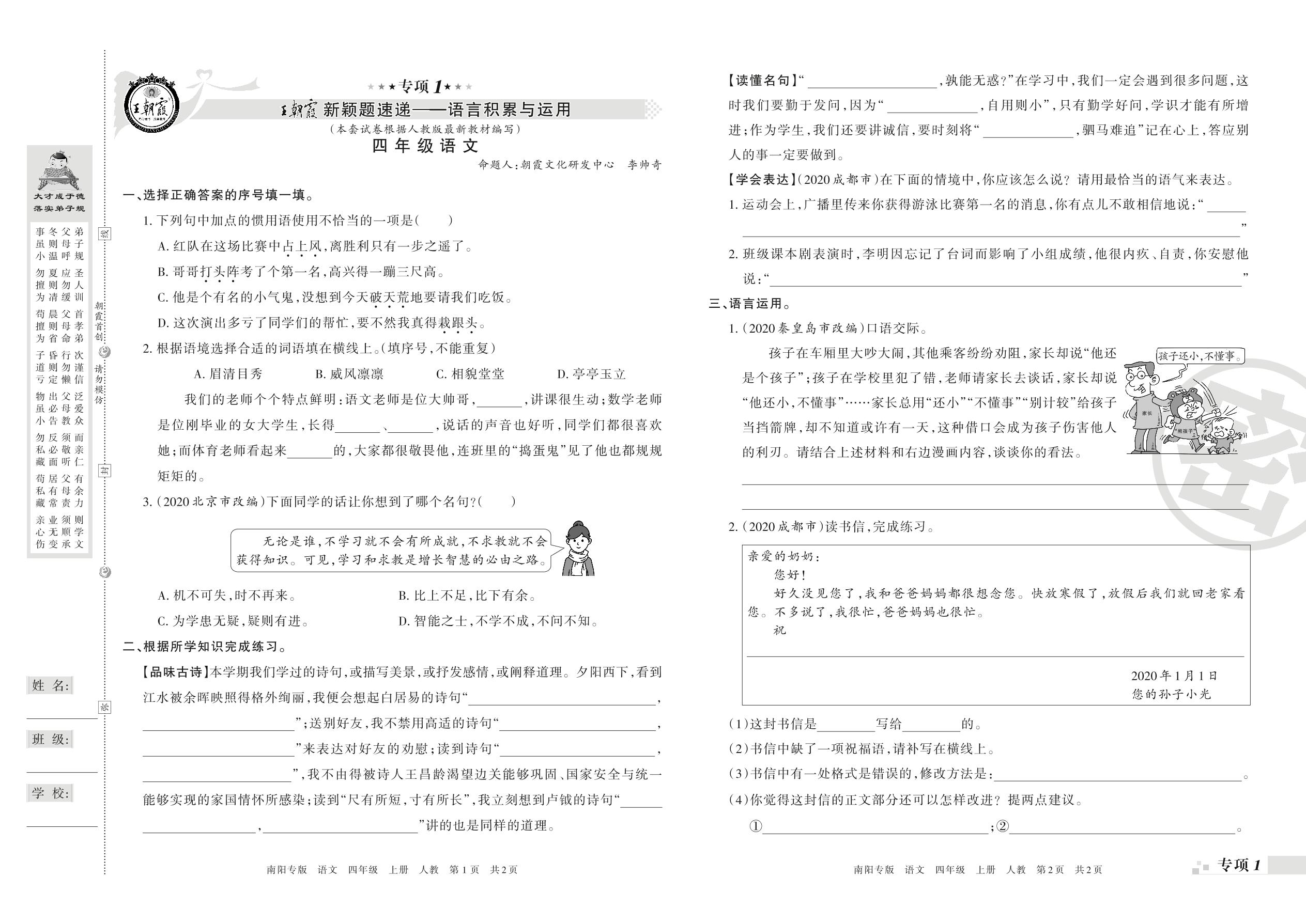 王朝霞期末专项卷——语言积累与运用、非连续性文本阅读四年级上册语文(人教版)