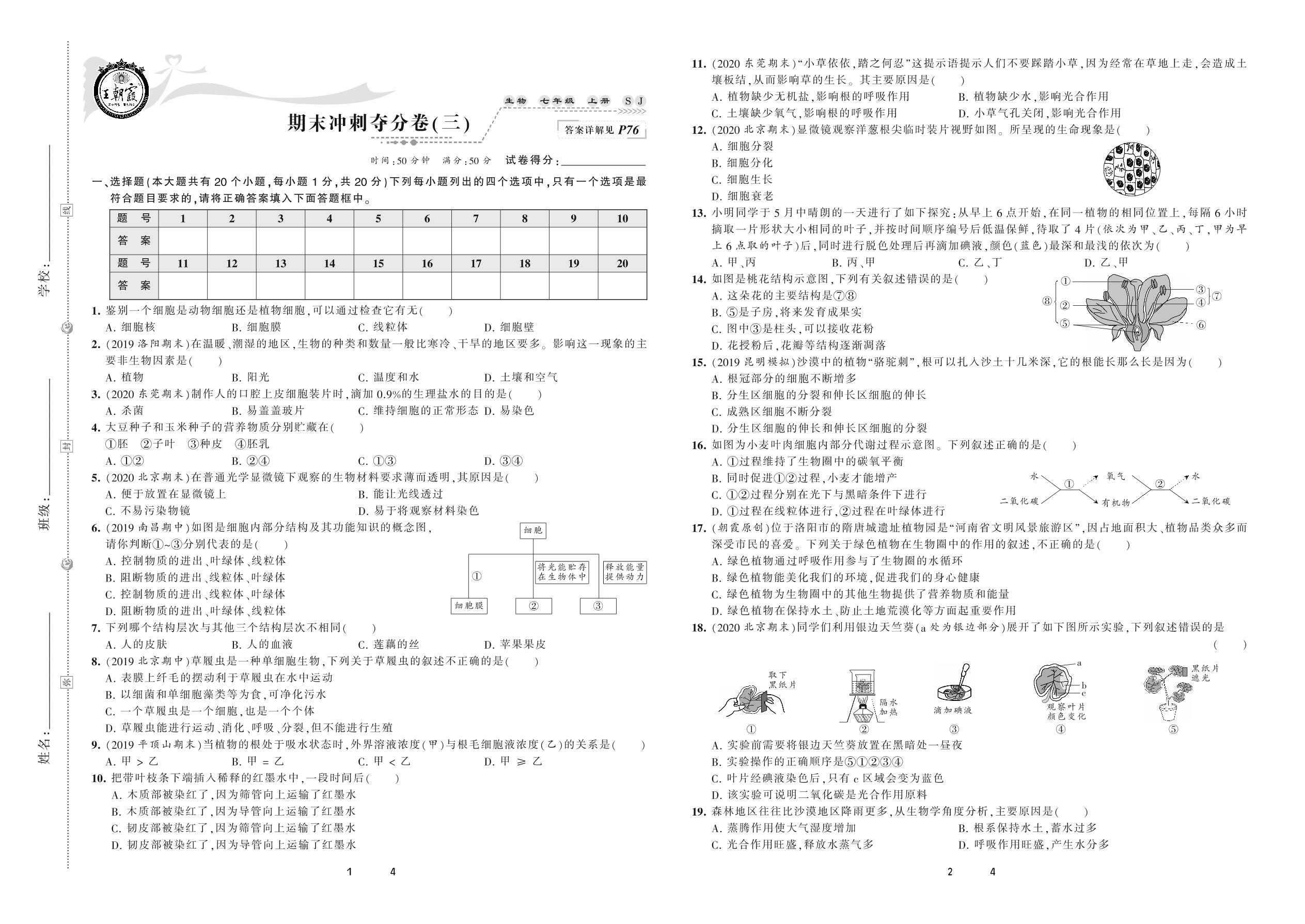 2020上册七年级生物苏教版 期末冲刺夺分卷(三)