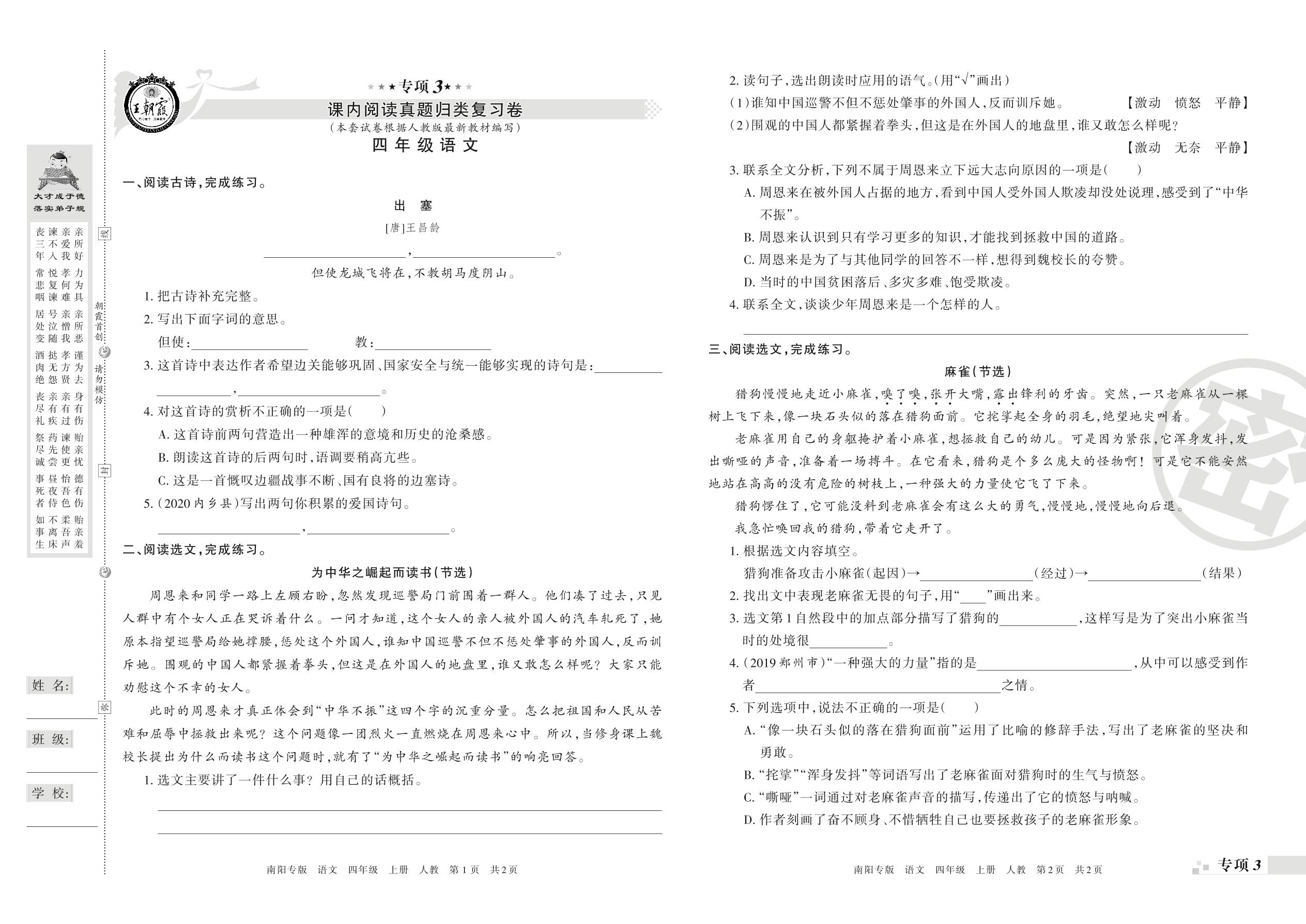王朝霞期末专项卷——课内阅读、课外阅读真题归类复习四年级上册语文(人教版)