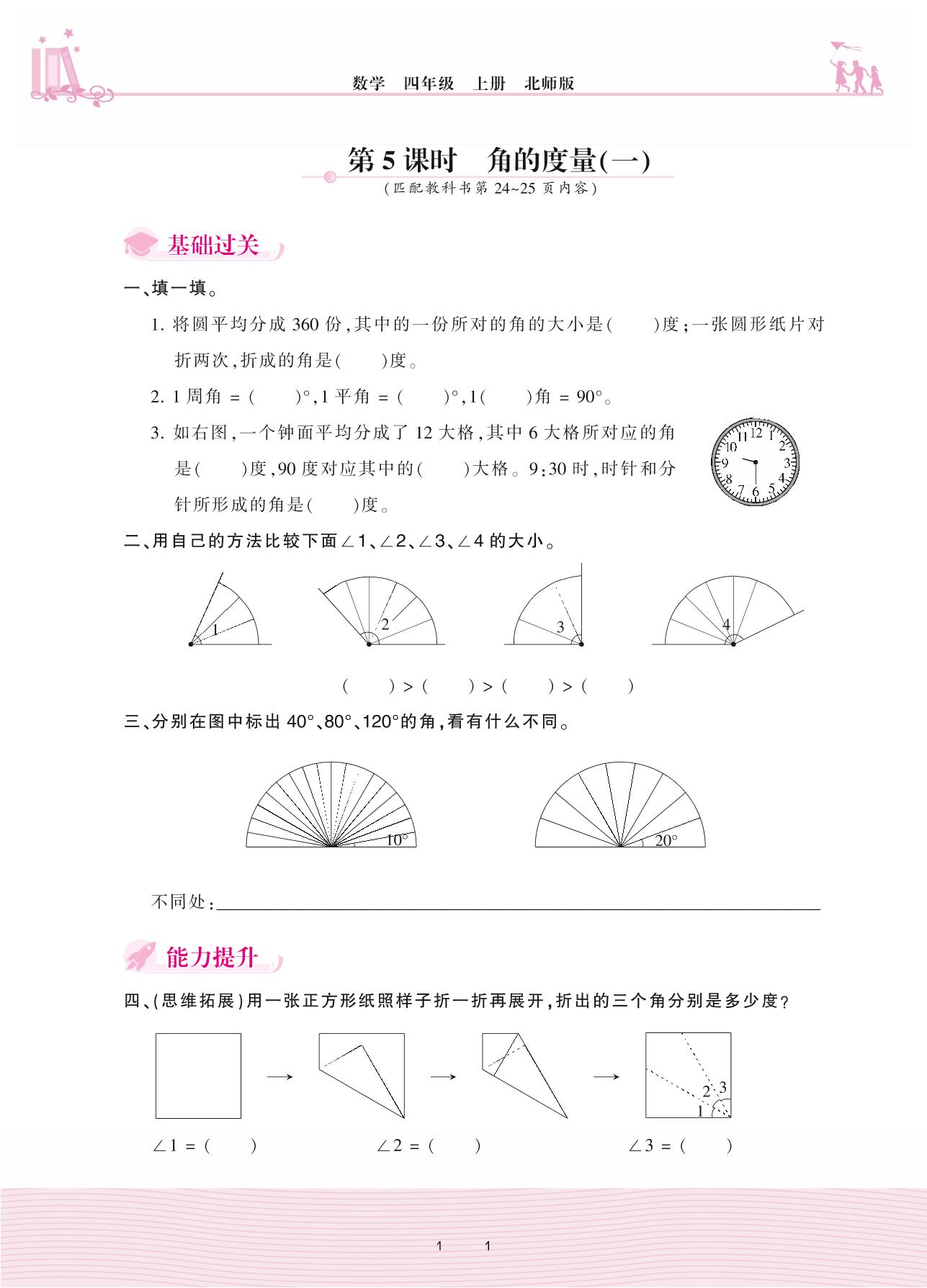 2020上册四年级数学北师版 二 线与角—第5课时 角的度量(一)