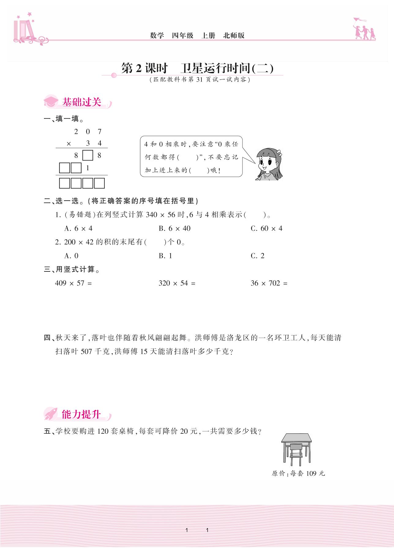 2020上册四年级数学北师版 三 乘法—第2课时 卫星运行时间(二)