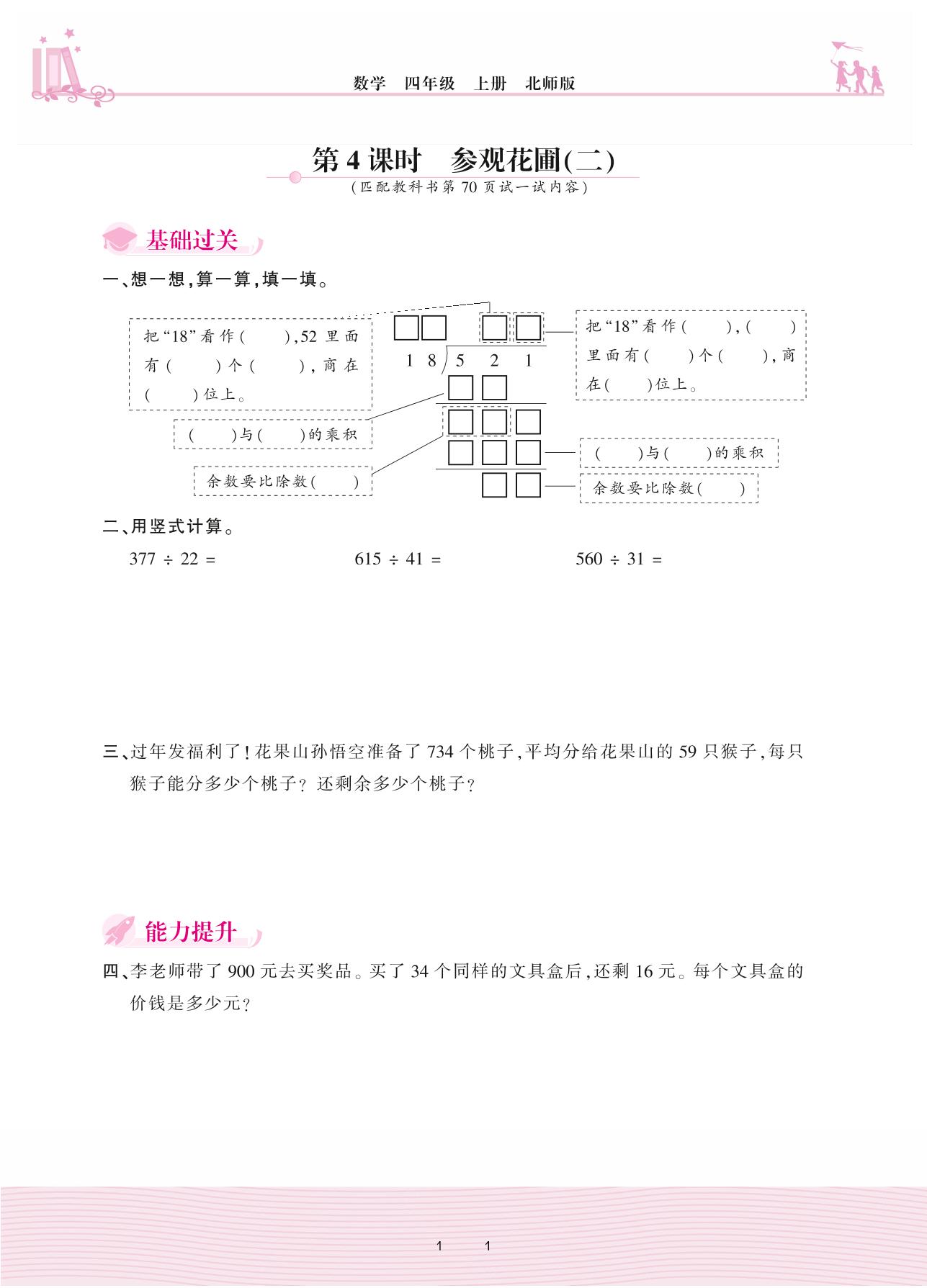 2020上册四年级数学北师版 六 除法—第4课时 参观花圃(二)