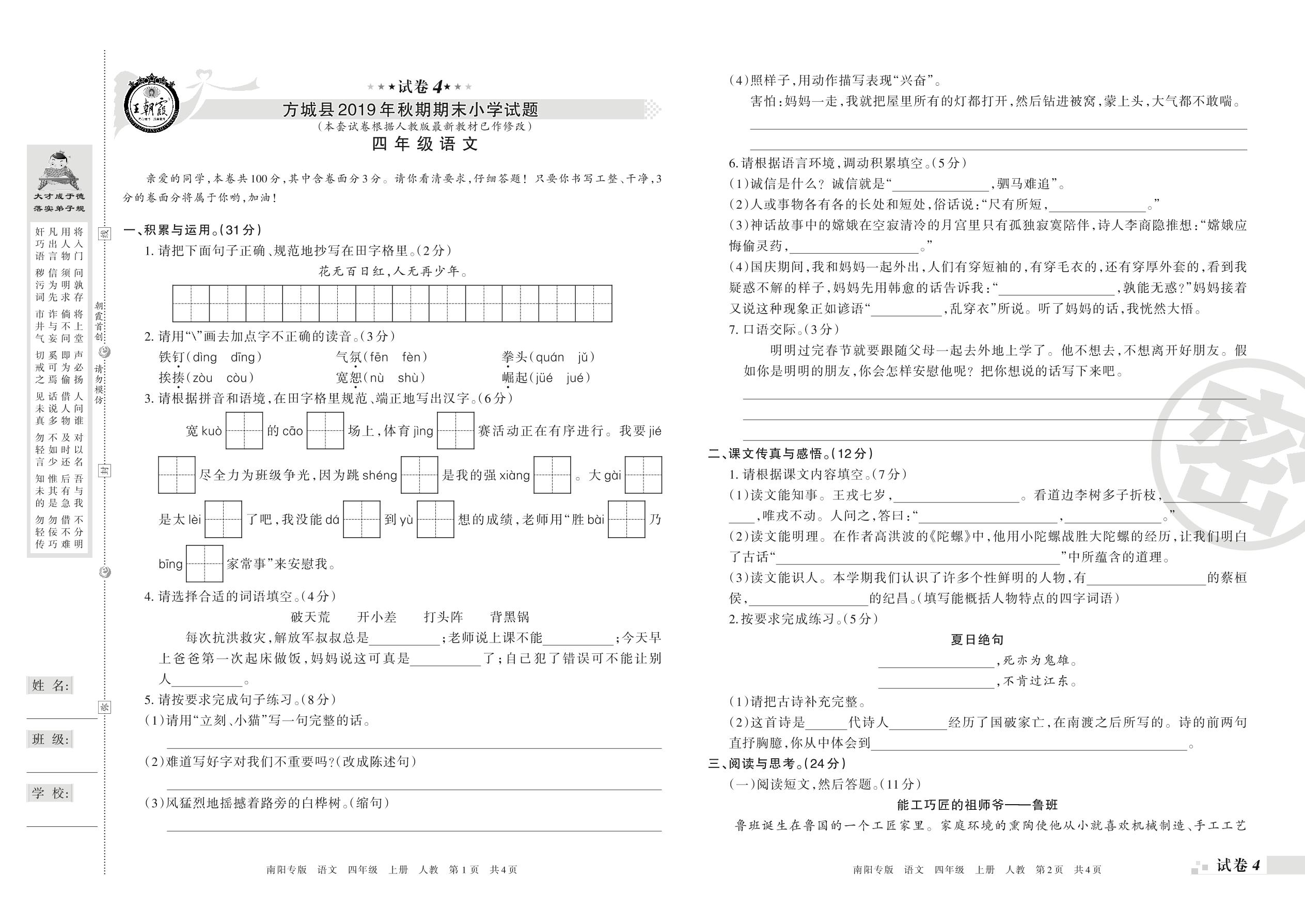 2019-2020学年第一学期南阳市方城县四年级语文试卷(人教版)【4】
