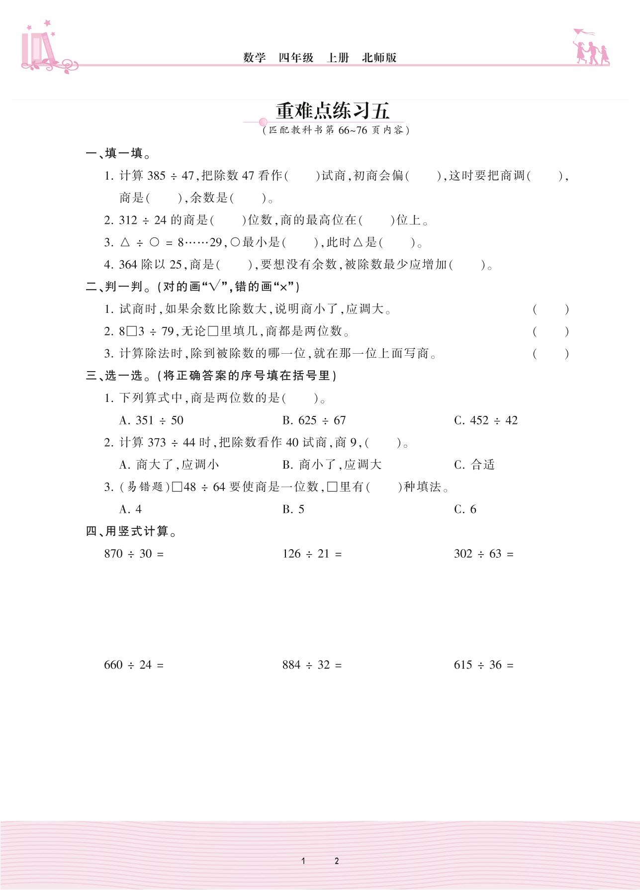 2020上册四年级数学北师版 六 除法—重难点练习五