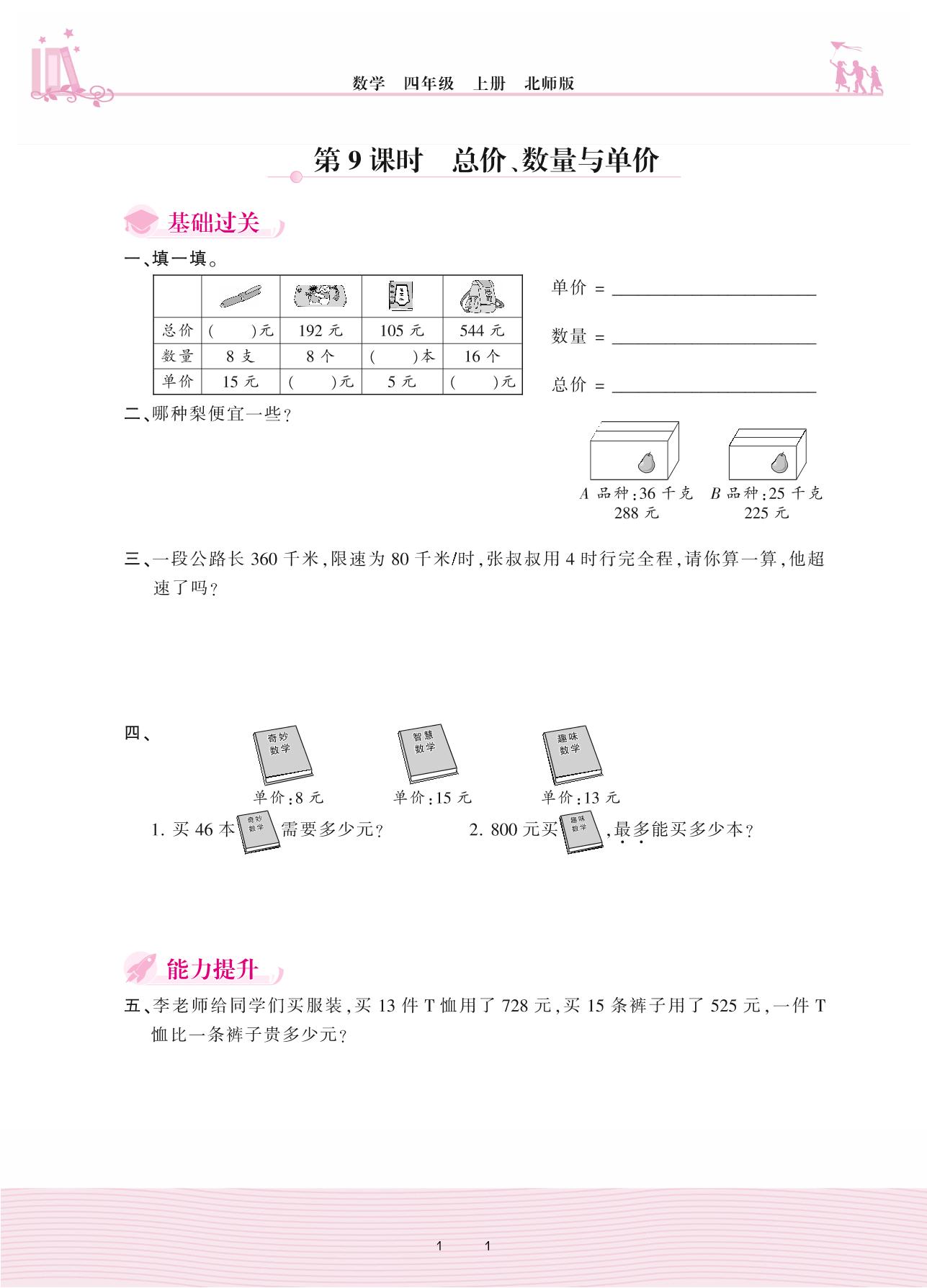 2020上册四年级数学北师版 六 除法—第9课时 总价、数量与单价