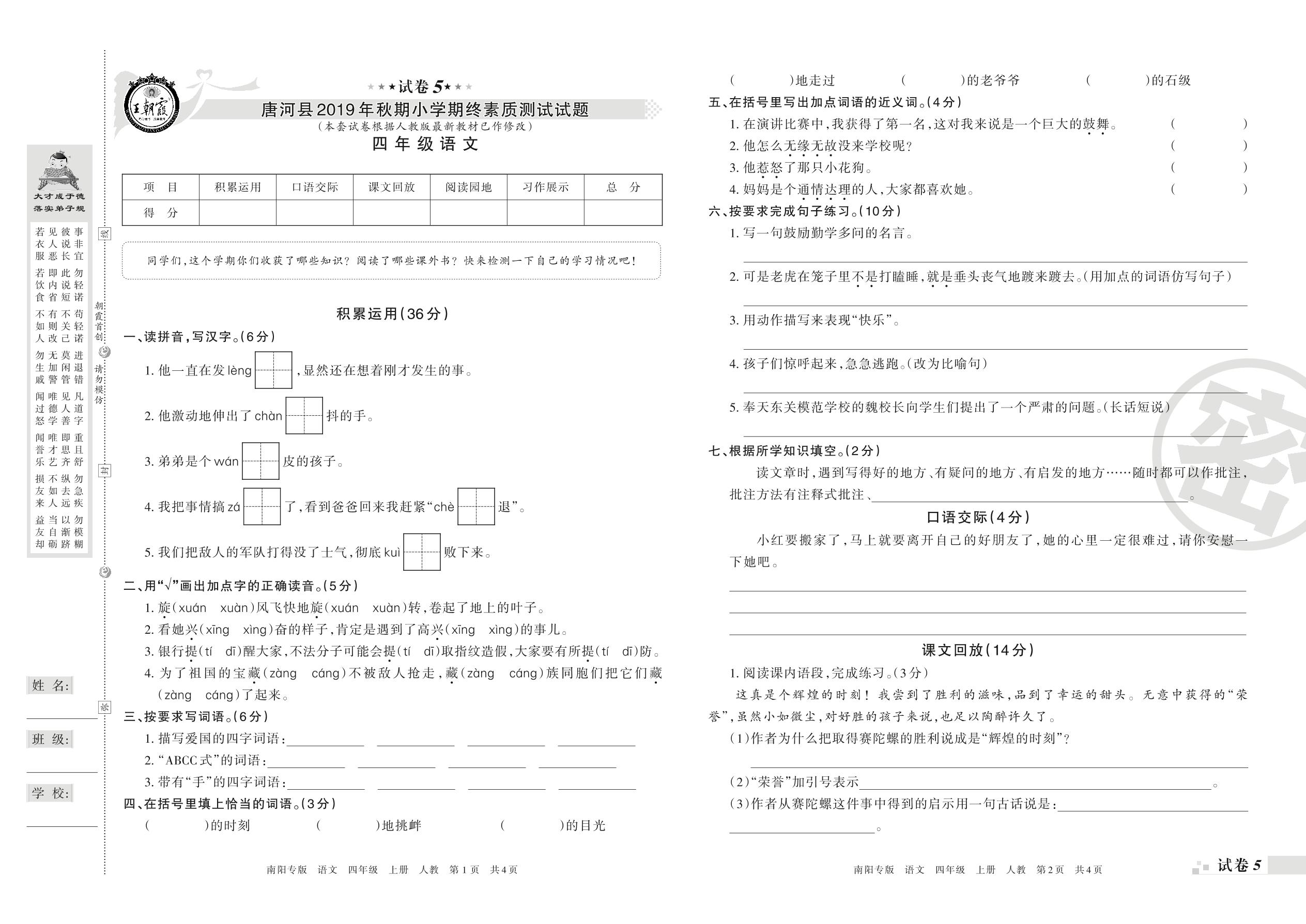 2019-2020学年第一学期南阳市唐河县四年级语文试卷(人教版)【5】