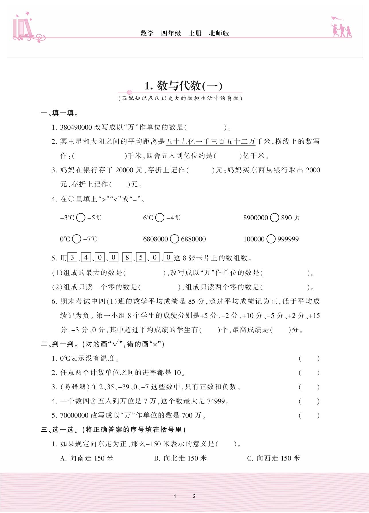 2020上册四年级数学北师版 总复习—1. 数与代数(一)