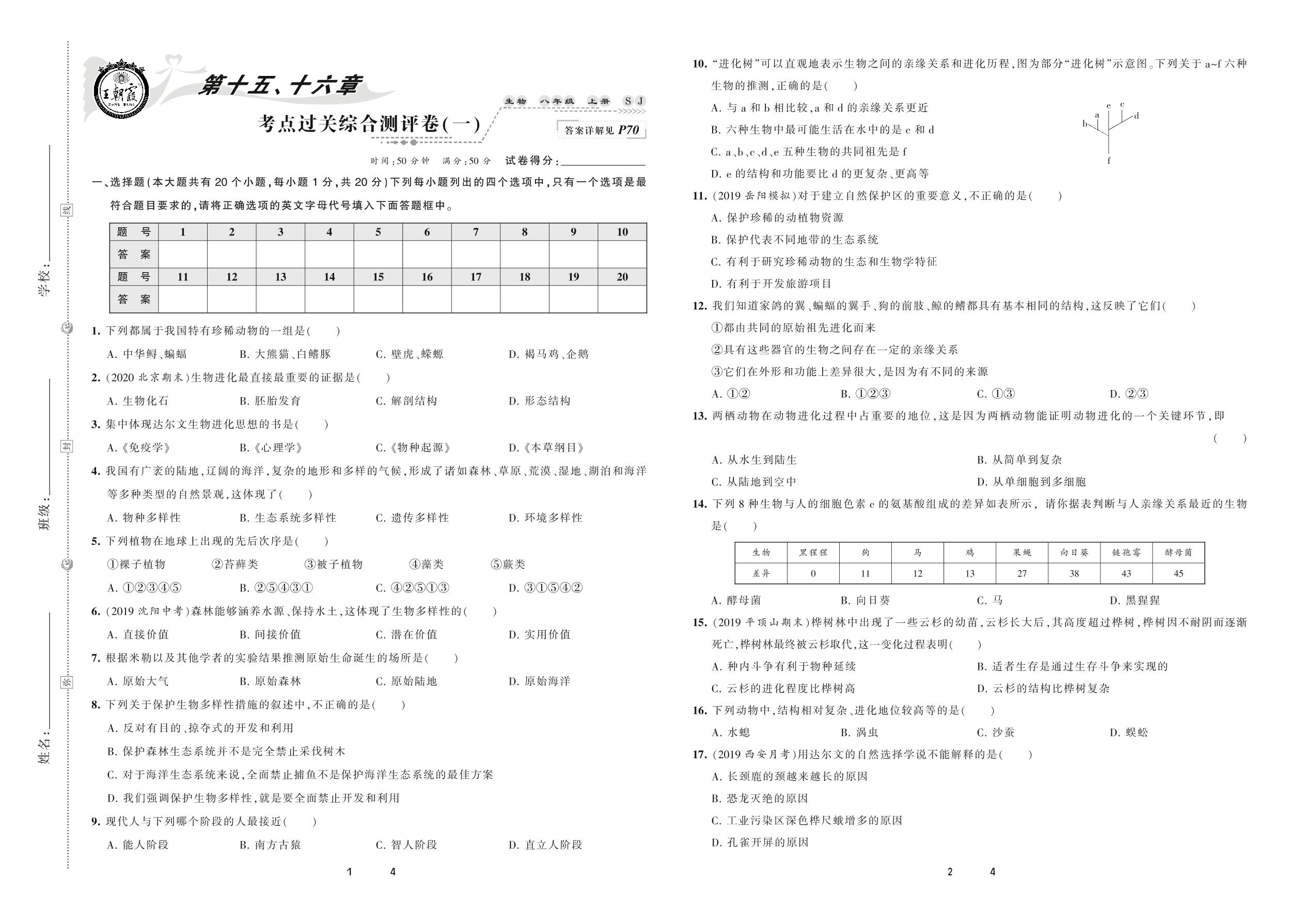 2020上册八年级生物苏教版 第十五、十六章 考点过关综合测评卷(一)