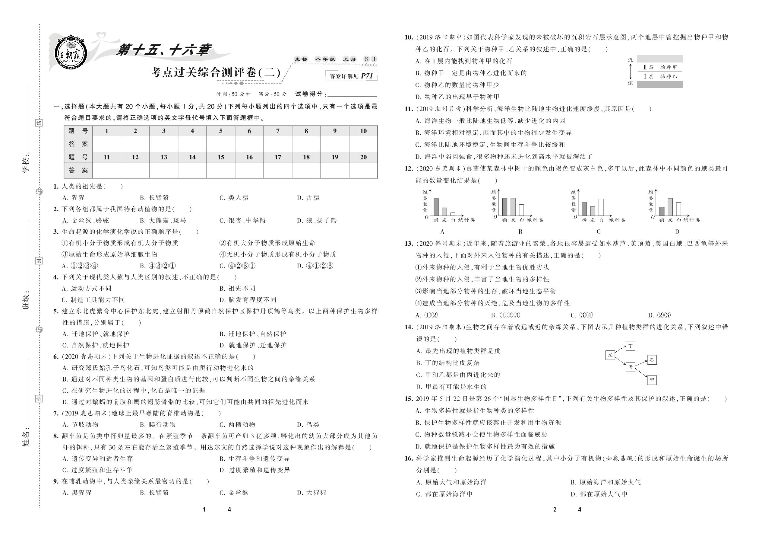 2020上册八年级生物苏教版 第十五、十六章 考点过关综合测评卷(二)