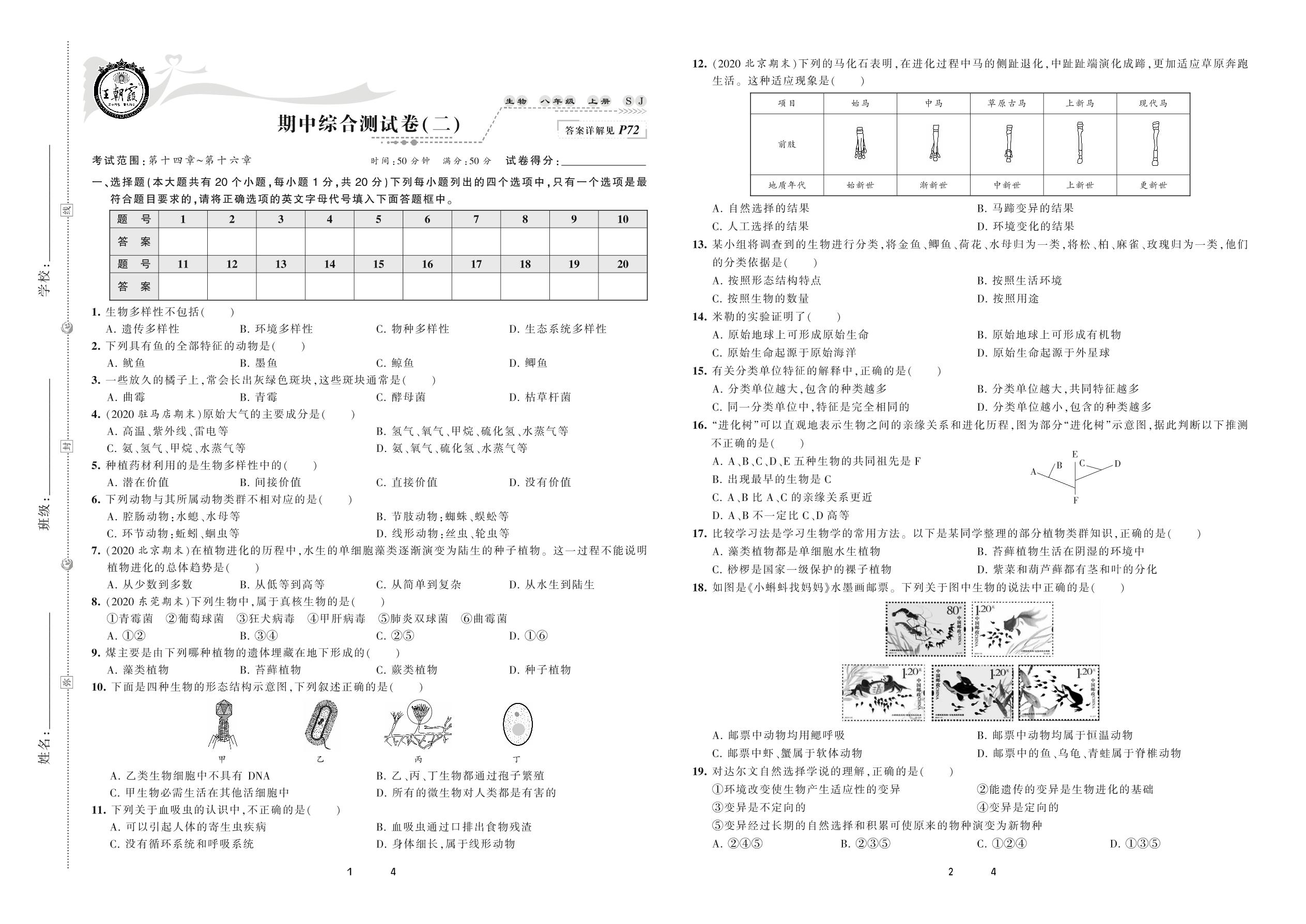 2020上册八年级生物苏教版 期中综合测试卷(二)