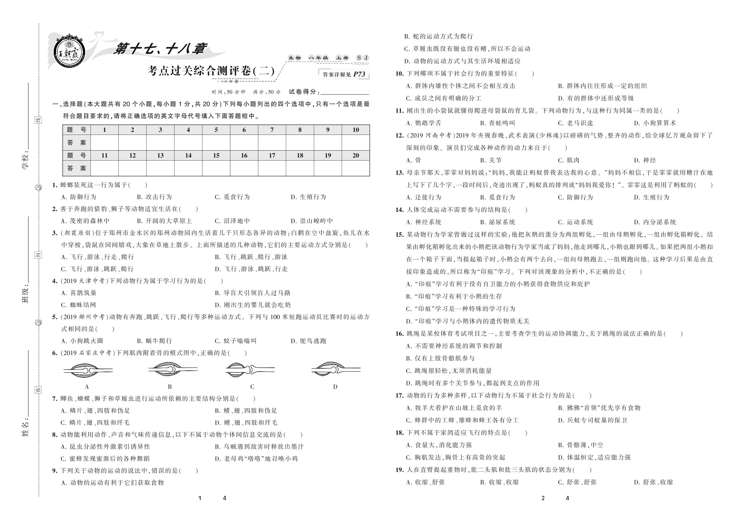 2020上册八年级生物苏教版 第十七、十八章 考点过关综合测评卷(二)