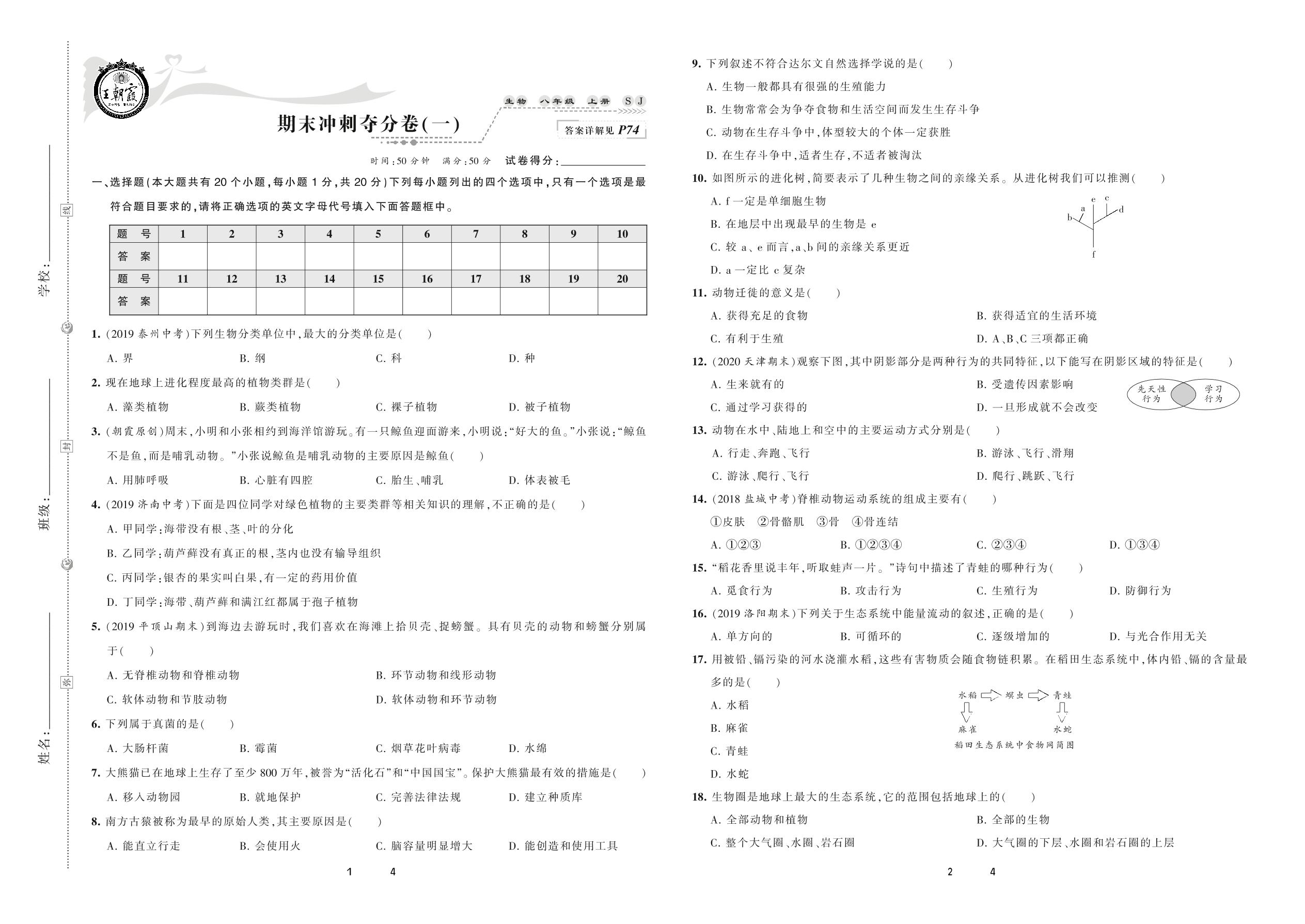 2020上册八年级生物苏教版 期末冲刺夺分卷(一)