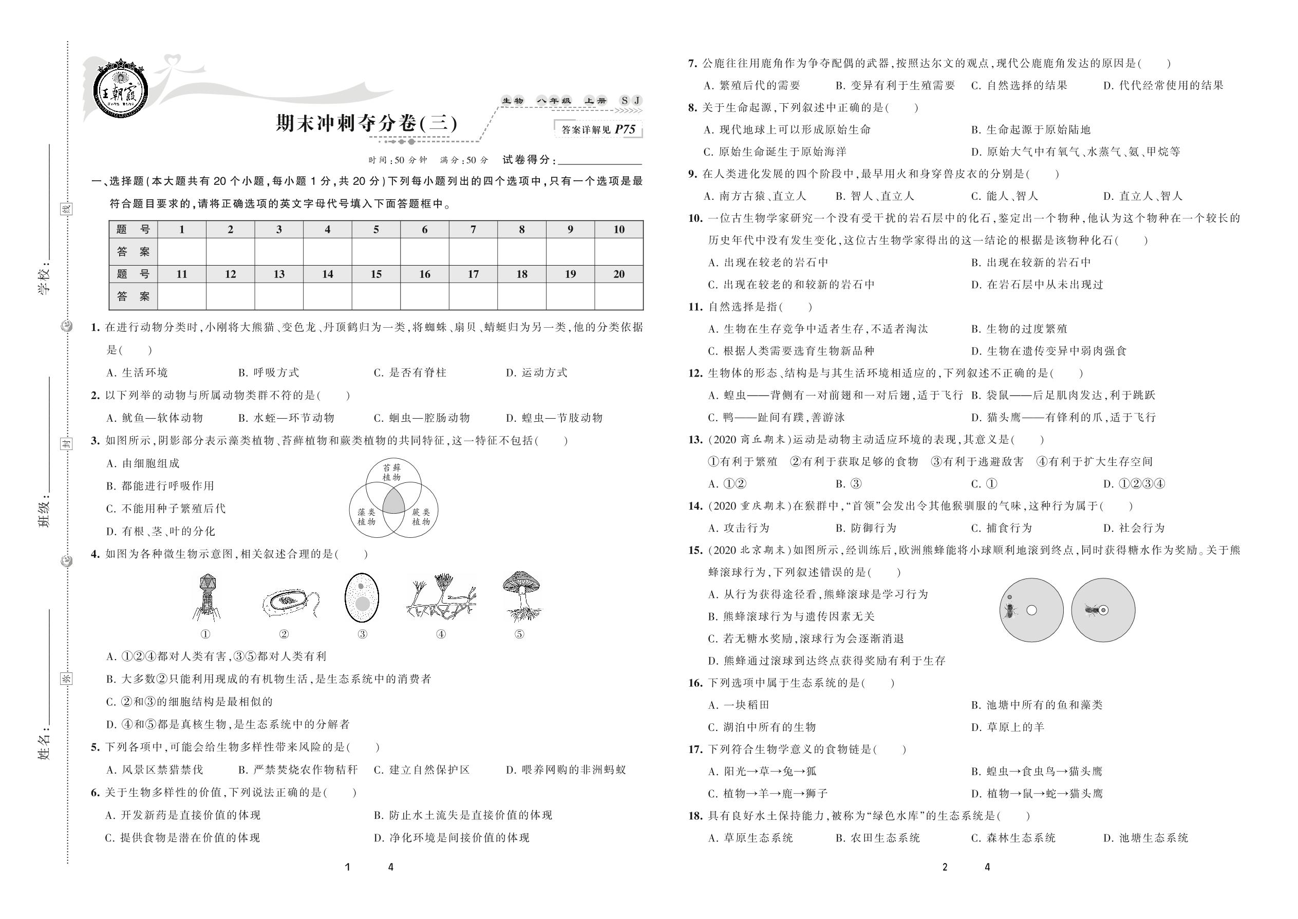 2020上册八年级生物苏教版 期末冲刺夺分卷(三)