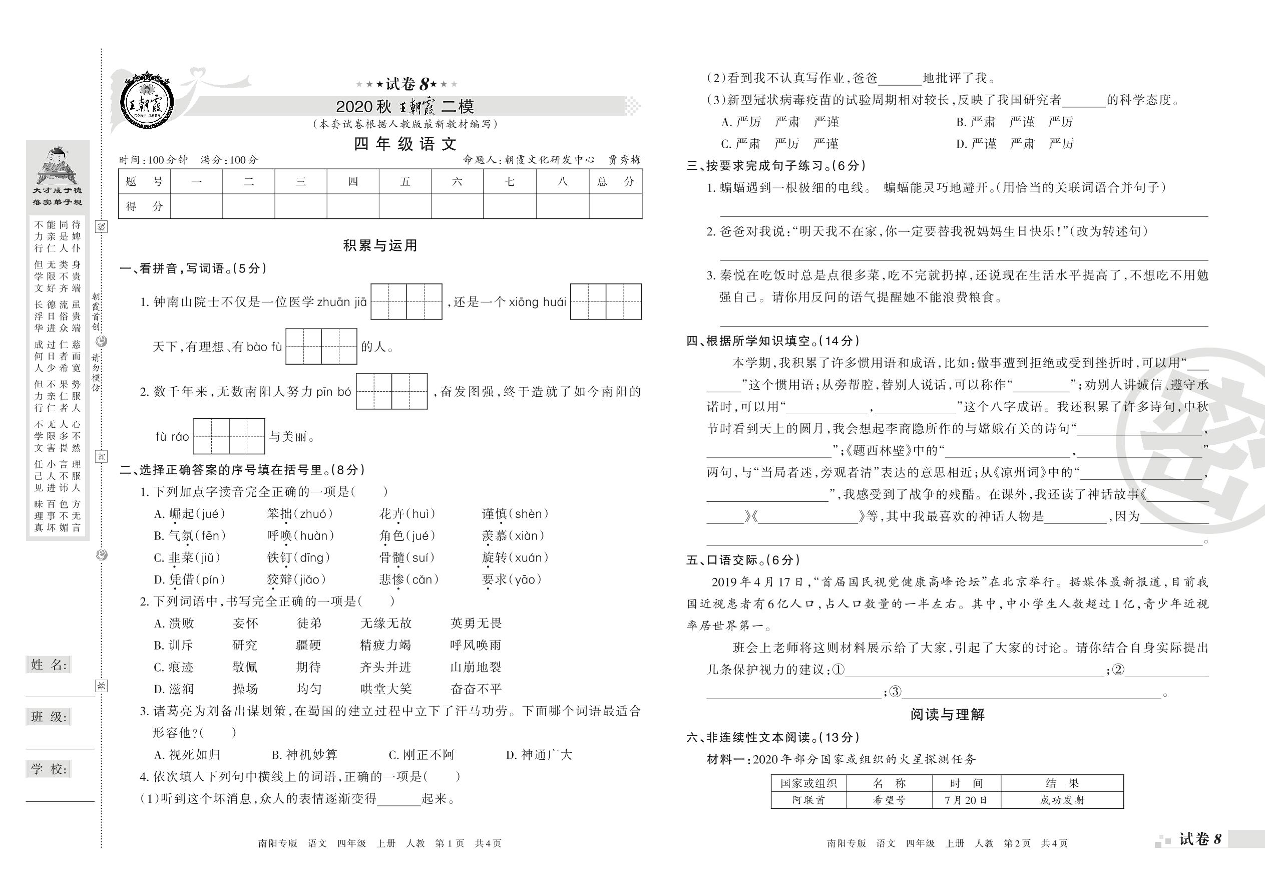 王朝霞期末模拟卷四年级上册语文(人教版)_R210801184757【8】