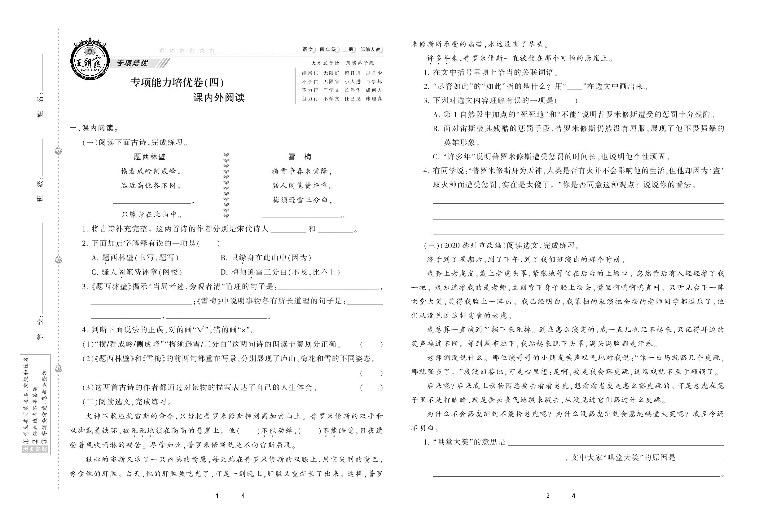 2020上册四年级语文人教版 专项能力培优卷(四) 课内外阅读