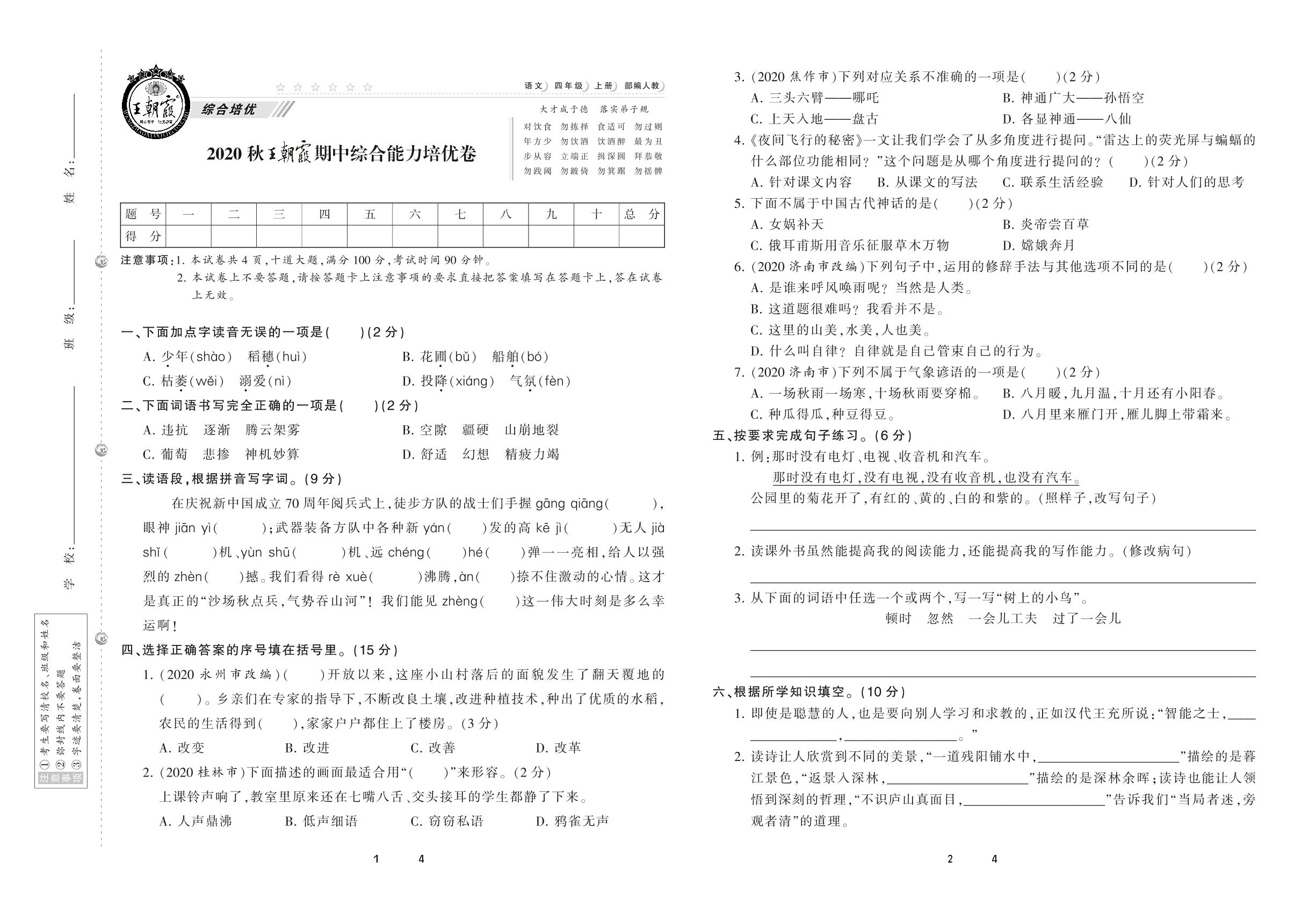 2020上册四年级语文人教版 王朝霞期中综合能力培优卷