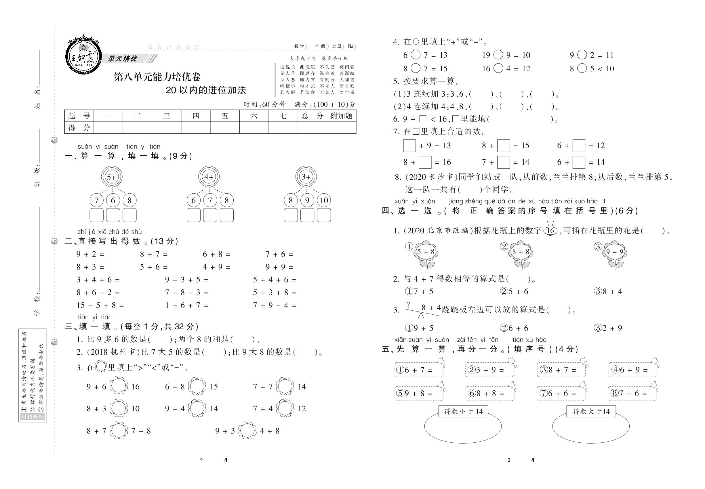 2020上册一年级数学人教版 第八单元 能力培优卷