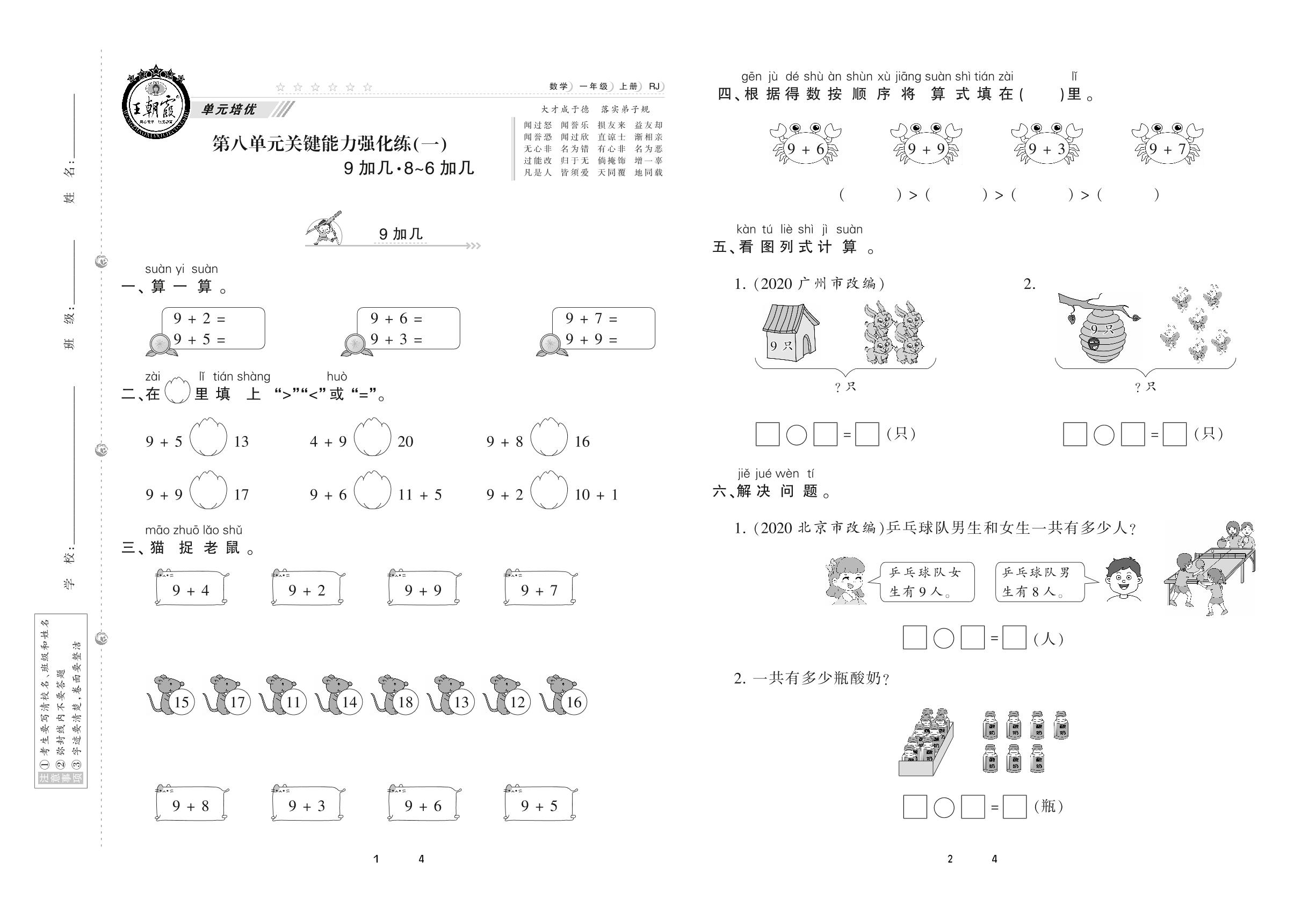 2020上册一年级数学人教版 第八单元 关键能力强化练(一)