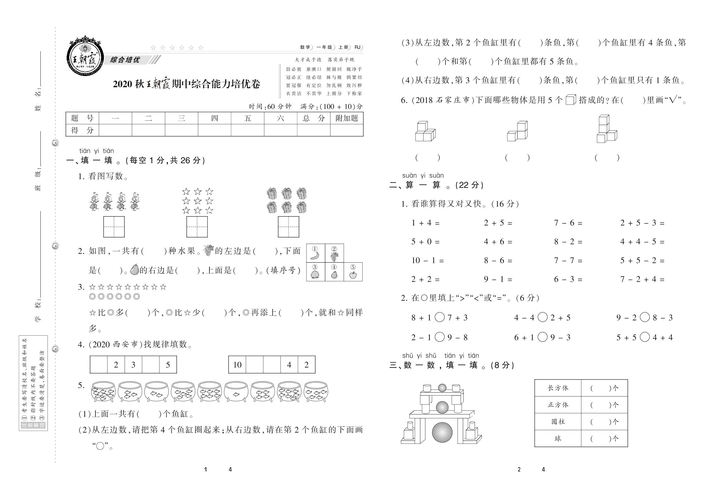 2020上册一年级数学人教版 王朝霞期中综合能力培优卷