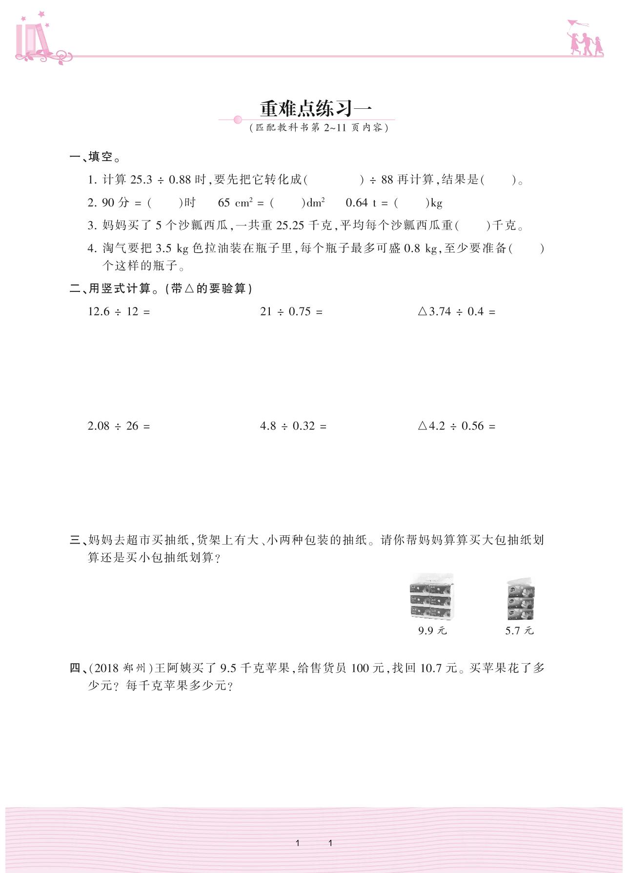 2020上册五年级数学北师版 一 小数除法——重难点练习一