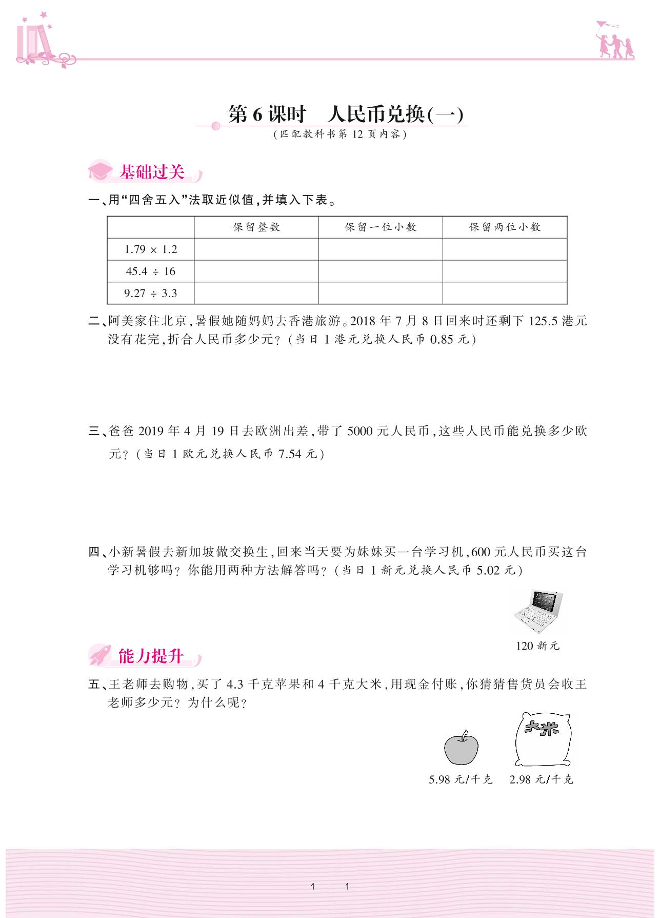 2020上册五年级数学北师版 一 小数除法——第6课时 人民币兑换(一)